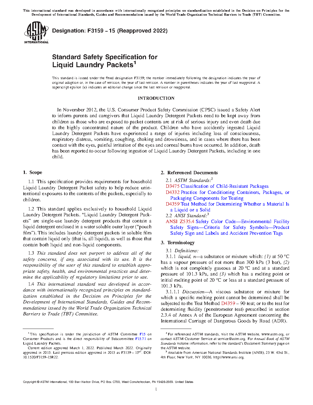 1.1 This specification provides requirements for household Liquid Laundry Detergent Packet safety to help reduce unintentional exposures to the contents of the packets, especially to children.