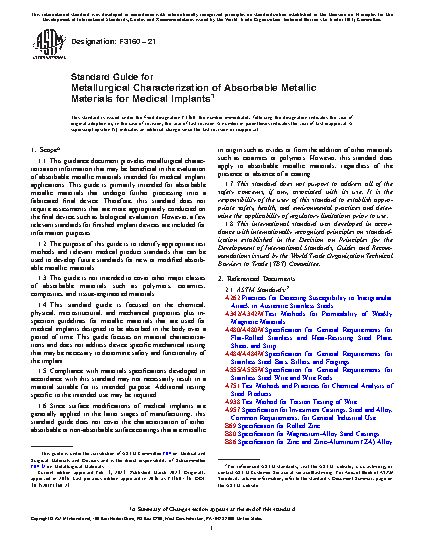 1.1 This guidance document provides metallurgical characterization information that may be beneficial in the evaluation of absorbable metallic materials intended for medical implant applications. This guide is primarily intended for absorbable metallic materials that undergo further processing into a fabricated final device. Therefore, this standard does not require assessments that are more appropriately conducted on the final device, such as biological evaluation. However, a few relevant standards for finished implant devices are included for information purposes.