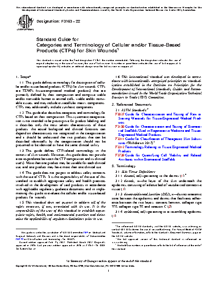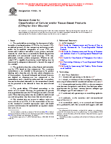 5.3 This guide is distinguished from ASTM Standard F2311, which defines terminology and provides classification by clinical use for products that can be substituted for tissue grafts of human or animal tissue in medical and surgical therapies of skin lesions. In contrast, this guide defines terminology for description of CTPs for skin wounds; CTPs are defined primarily by their composition. Neither guide establishes a correspondence between device structure and clinical function.