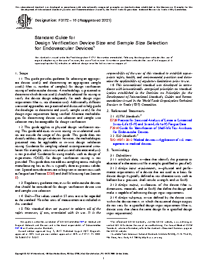 1.1 This guide provides guidance for selecting an appropriate device size(s) and determining an appropriate sample size(s) (that is, number of samples) for design verification testing of endovascular devices. A methodology is presented to determine which device size(s) should be selected for testing to verify the device design adequately for each design input requirement (that is, test characteristic). Additionally, different statistical approaches are presented and discussed to help guide the developer to determine and justify sample size(s) for the design input requirement being verified. Alternate methodologies for determining device size selection and sample size selection may be acceptable for design verification.