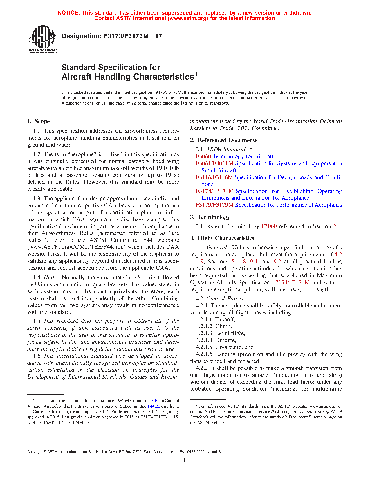 1.1 This specification addresses the airworthiness requirements for aeroplane handling characteristics in flight and on ground and water.
