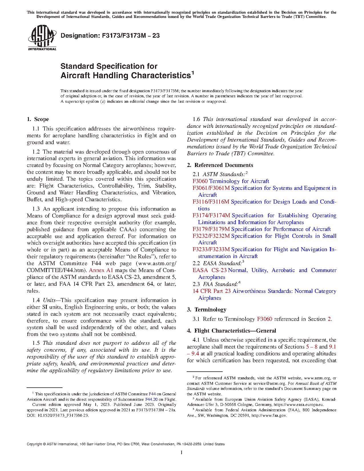 1.3 An applicant intending to propose this information as Means of Compliance for a design approval must seek guidance from their respective oversight authority (for example, published guidance from applicable CAAs) concerning the acceptable use and application thereof. For information on which oversight authorities have accepted this specification (in whole or in part) as an acceptable Means of Compliance to their regulatory requirements (hereinafter “the Rules”), refer to the ASTM Committee F44 web page (www.astm.org/COMMITTEE/F44.htm). Annex A1 maps the Means of Compliance of the ASTM standards to EASA CS-23, amendment 5, or later, and FAA 14 CFR Part 23, amendment 64, or later, rules.