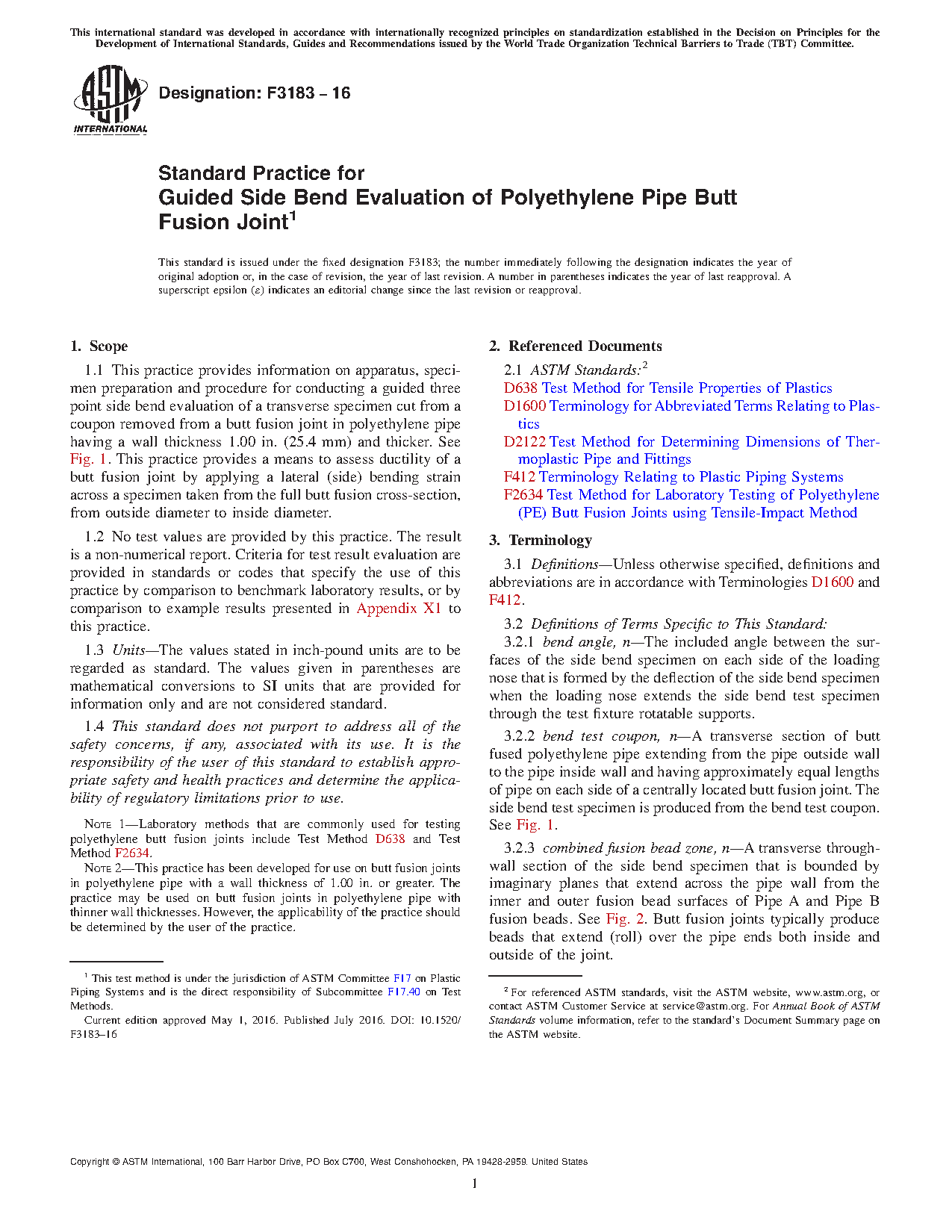 1.1 This practice provides information on apparatus, specimen preparation and procedure for conducting a guided three point side bend evaluation of a transverse specimen cut from a coupon removed from a butt fusion joint in polyethylene pipe having a wall thickness 1.00 in. (25.4 mm) and thicker. See Fig. 1. This practice provides a means to assess ductility of a butt fusion joint by applying a lateral (side) bending strain across a specimen taken from the full butt fusion cross-section, from outside diameter to inside diameter.