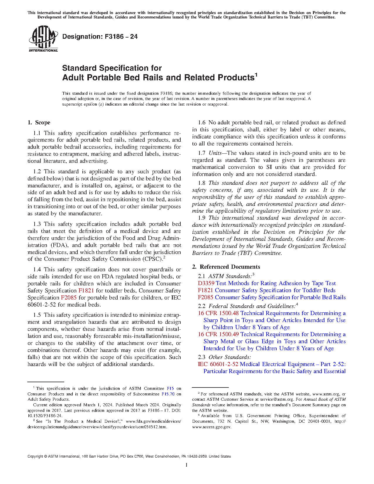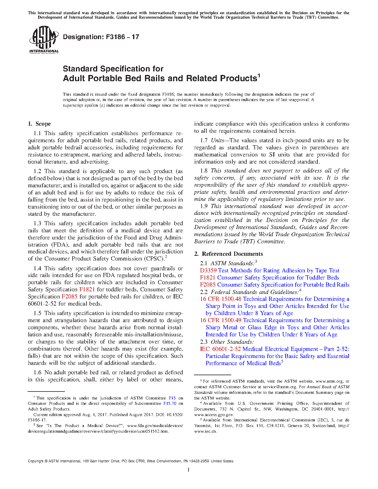 This safety specification establishes the performance requirements for adult portable bed rails, related products, and adult portable bedrail accessories, including requirements for resistance to entrapment, marking and adhered labels, instructional literature, and advertising. It is intended to minimize entrapment and strangulation hazards that are attributed to design components, whether these hazards arise from normal installation and use, reasonably foreseeable mis-installation/misuse, or changes to the stability of the attachment over time, or combinations thereof. This specification applies to adult portable bed rails that meet the definition of a medical device and are therefore under the jurisdiction of the Food and Drug Administration (FDA), and to adult portable bed rails that are not medical devices, and which therefore fall under the jurisdiction of the Consumer Product Safety Commission (CPSC).