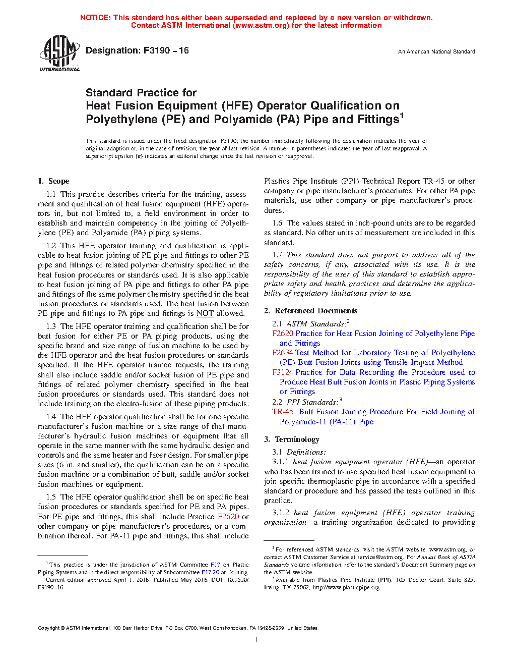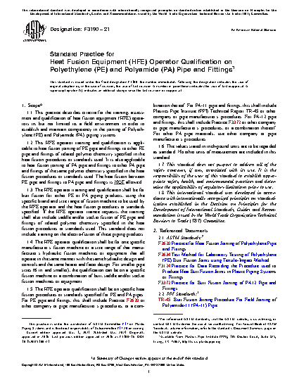 1.5 The HFE operator qualification shall be on specific heat fusion procedures or standards specified for PE and PA pipes. For PE pipe and fittings, this shall include Practice F2620 or other company or pipe manufacturer’s procedures, or a combination thereof. For PA-11 pipe and fittings, this shall include Plastics Pipe Institute (PPI) Technical Report TR-45 or other company or pipe manufacturer’s procedures. For other PA pipe materials, use other company or pipe manufacturer’s procedures.