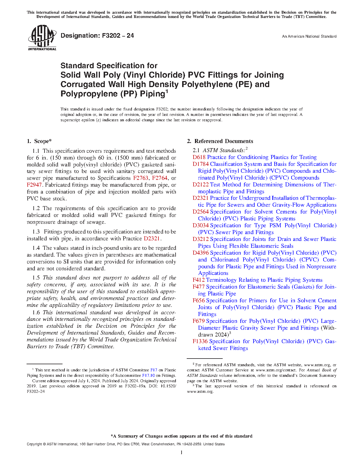 1.1 This specification covers requirements and test methods for 6 in. (150 mm) through 60 in. (1500 mm) fabricated or molded solid wall poly(vinyl chloride) (PVC) gasketed sanitary sewer fittings to be used with piping manufactured to Specifications F2763, F2764, or F2947. Fabricated fittings may be manufactured from pipe, or from a combination of pipe and injection molded parts with PVC base stock.