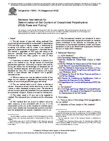 1.1 The gel content of pipe and tubing produced from crosslinked polyethylene plastics as described in Specification F876 and other pipe or tubing standards is determined by extracting with solvents such as xylenes. A test method for quantitative determination of gel content is described herein. The method is applicable to PEX pipe and tubing of all densities, including those containing fillers, and provides correction for the inert fillers present in some of those compounds.