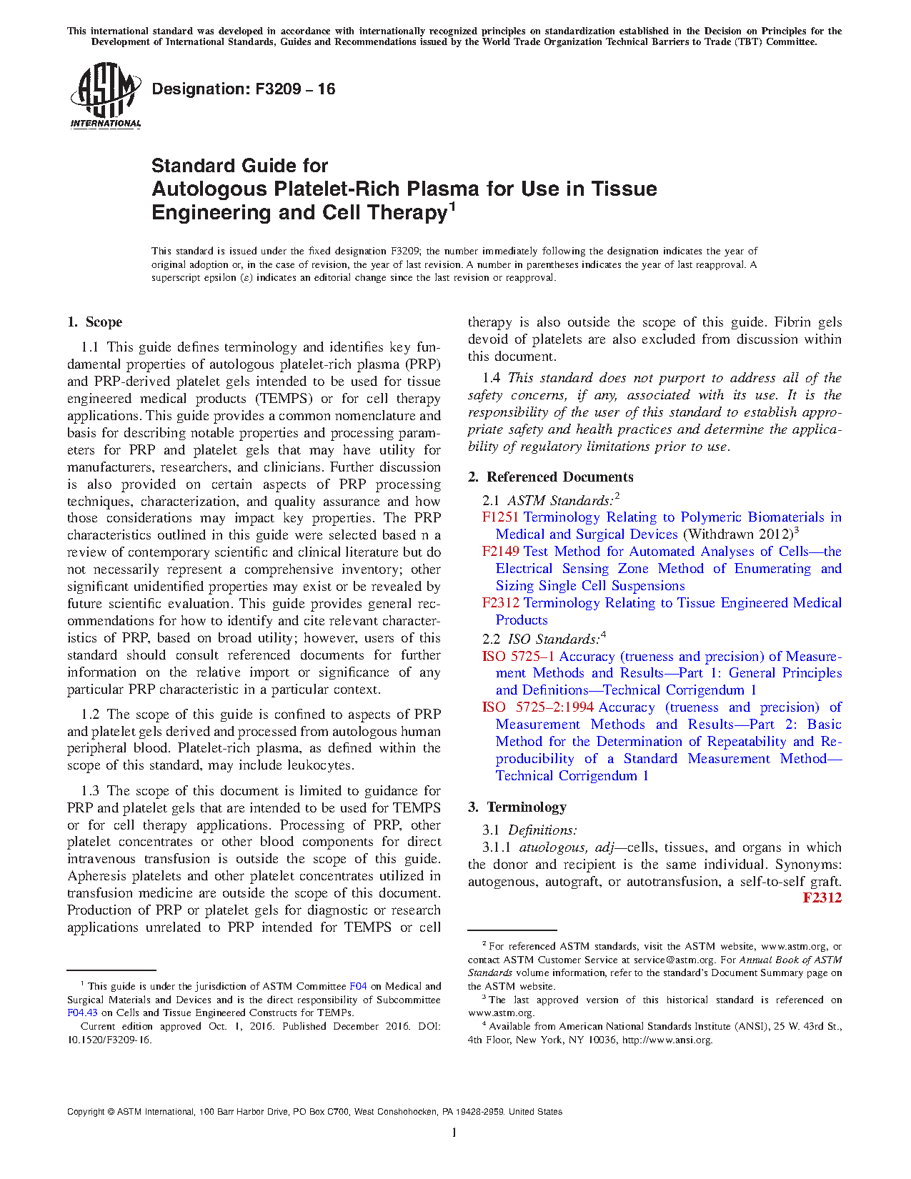 1.2 The scope of this guide is confined to aspects of PRP and platelet gels derived and processed from autologous human peripheral blood. Platelet-rich plasma, as defined within the scope of this standard, may include leukocytes.