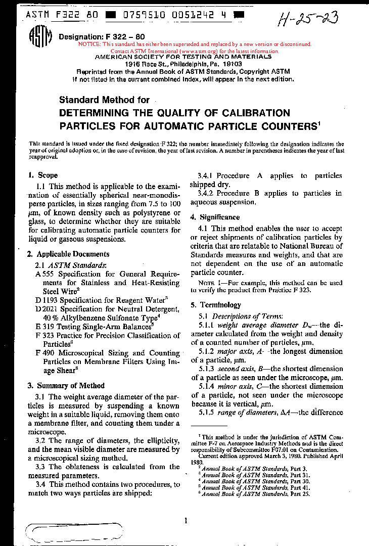 Method for Determining the Quality of Calibration Particles for Automatic Particle Counters (Withdrawn 1990)