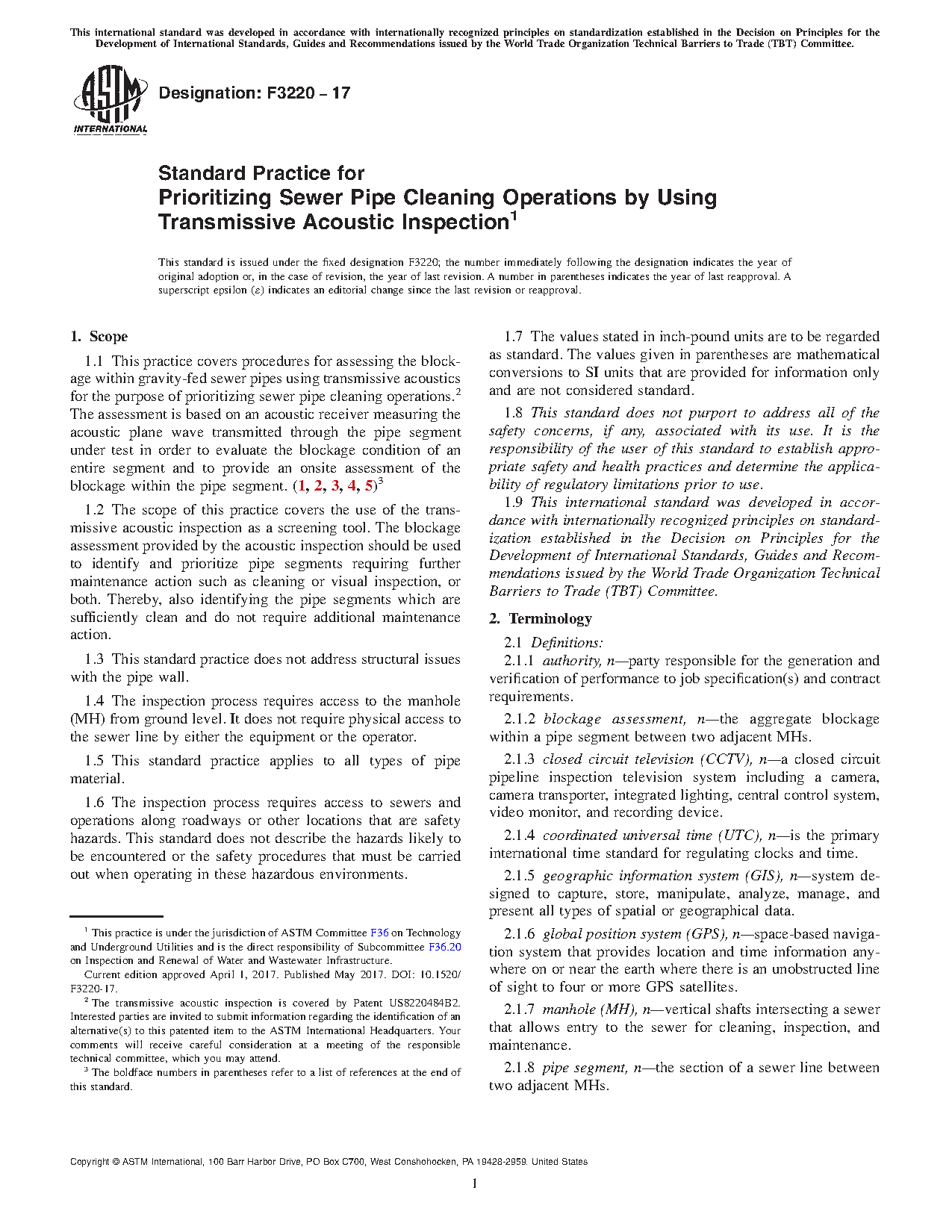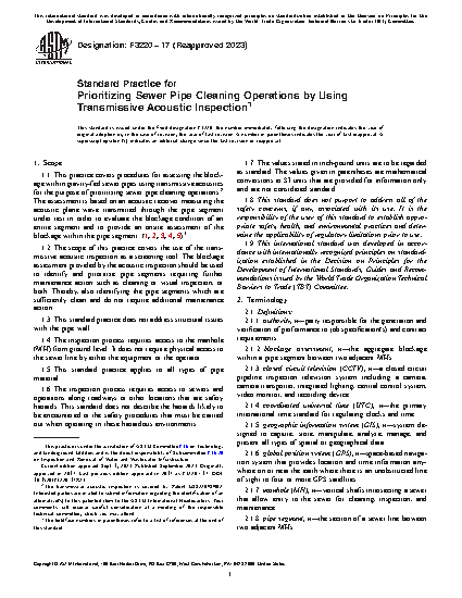 1.1 This practice covers procedures for assessing the blockage within gravity-fed sewer pipes using transmissive acoustics for the purpose of prioritizing sewer pipe cleaning operations.2 The assessment is based on an acoustic receiver measuring the acoustic plane wave transmitted through the pipe segment under test in order to evaluate the blockage condition of an entire segment and to provide an onsite assessment of the blockage within the pipe segment. (1, 2, 3, 4, 5)3