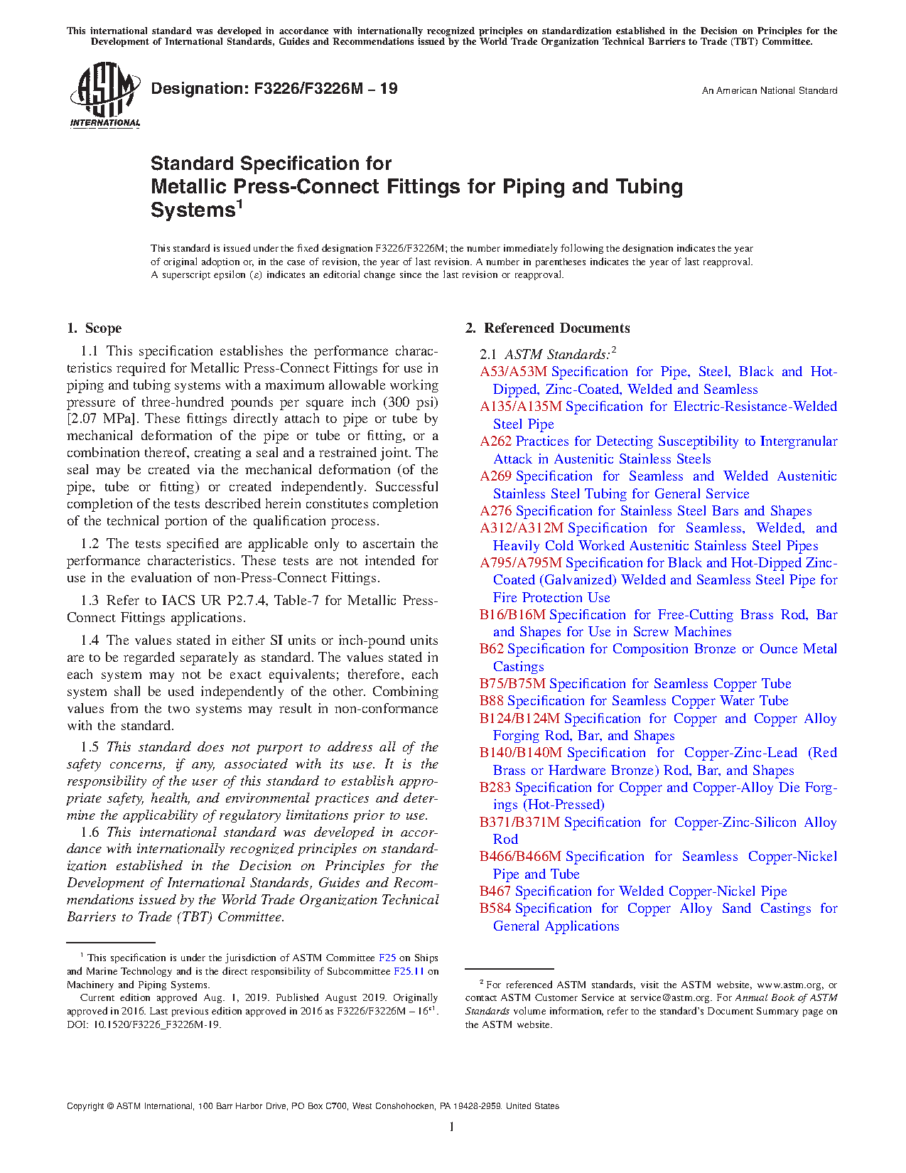 1.1 This specification establishes the performance characteristics required for Metallic Press-Connect Fittings for use in piping and tubing systems with a maximum allowable working pressure of three-hundred pounds per square inch (300 psi). These fittings directly attach to pipe or tube by mechanical deformation of the pipe or tube or fitting, or a combination thereof, creating a seal and a restrained joint. The seal may be created via the mechanical deformation (of the pipe, tube or fitting) or created independently. Successful completion of the tests described herein constitutes completion of the technical portion of the qualification process.
