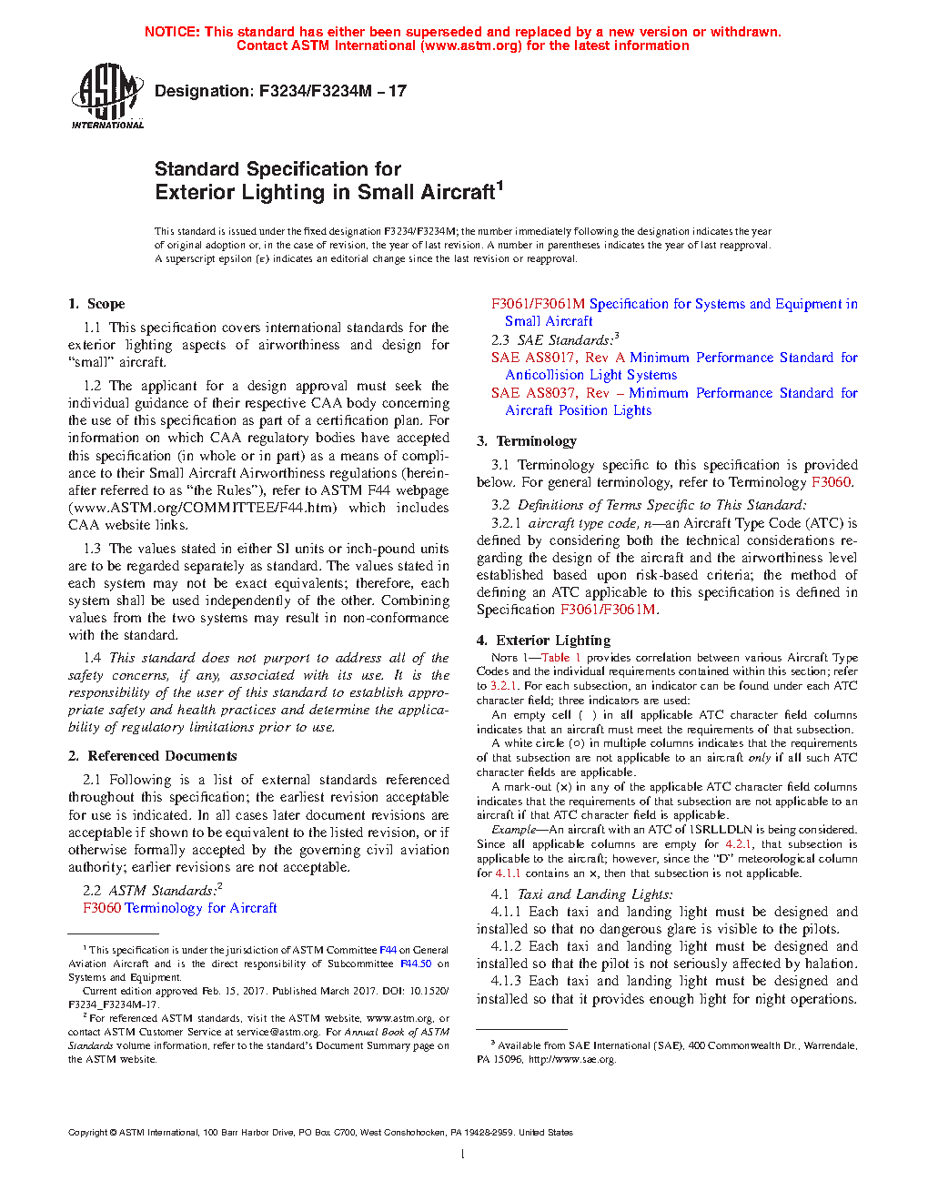 1.1 This specification covers international standards for the exterior lighting aspects of airworthiness and design for “small” aircraft.