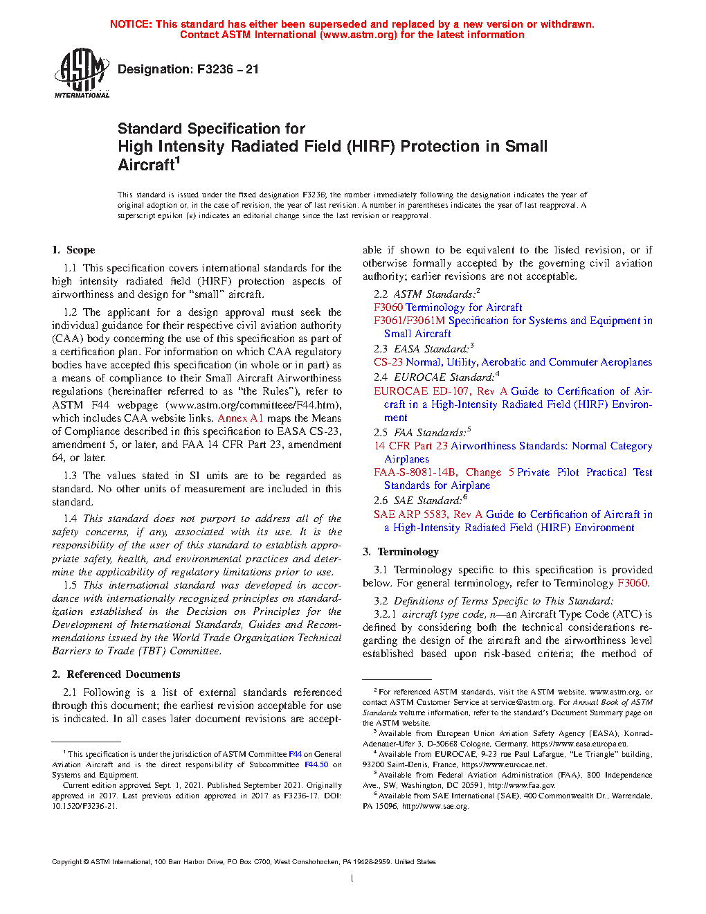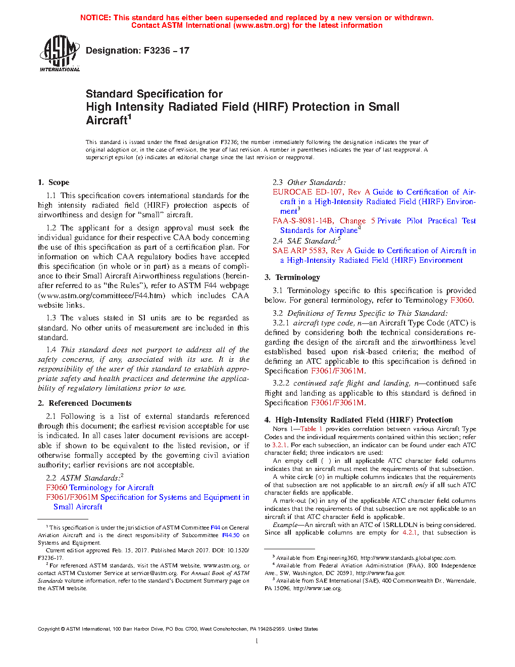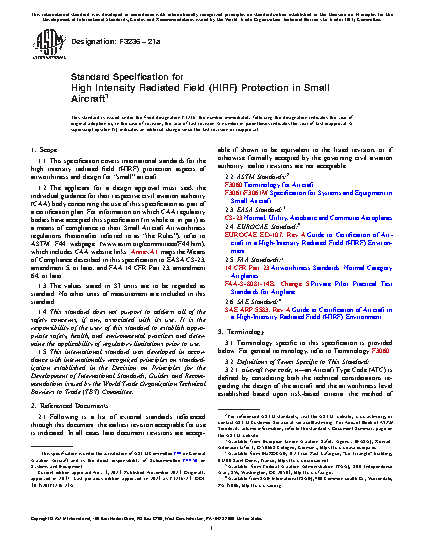 1.1 This specification covers international standards for the high intensity radiated field (HIRF) protection aspects of airworthiness and design for “small” aircraft.