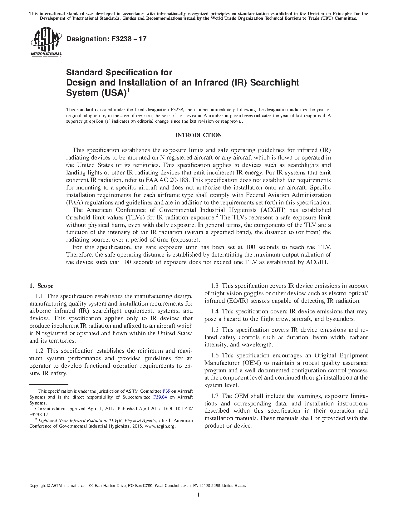 1.1 This specification establishes the manufacturing design, manufacturing quality system and installation requirements for airborne infrared (IR) searchlight equipment, systems, and devices. This specification applies only to IR devices that produce incoherent IR radiation and affixed to an aircraft which is N registered or operated and flown within the United States and its territories.