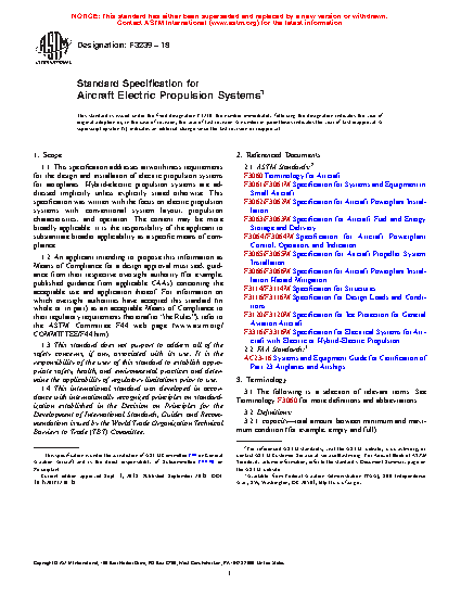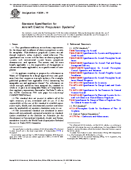 1.1 This specification addresses airworthiness requirements for the design and installation of electric propulsion systems for aeroplanes. Hybrid-electric propulsion systems are addressed implicitly unless explicitly stated otherwise. This specification was written with the focus on electric propulsion systems with conventional system layout, propulsion characteristics, and operation. The content may be more broadly applicable; it is the responsibility of the applicant to substantiate broader applicability as a specific means of compliance.
