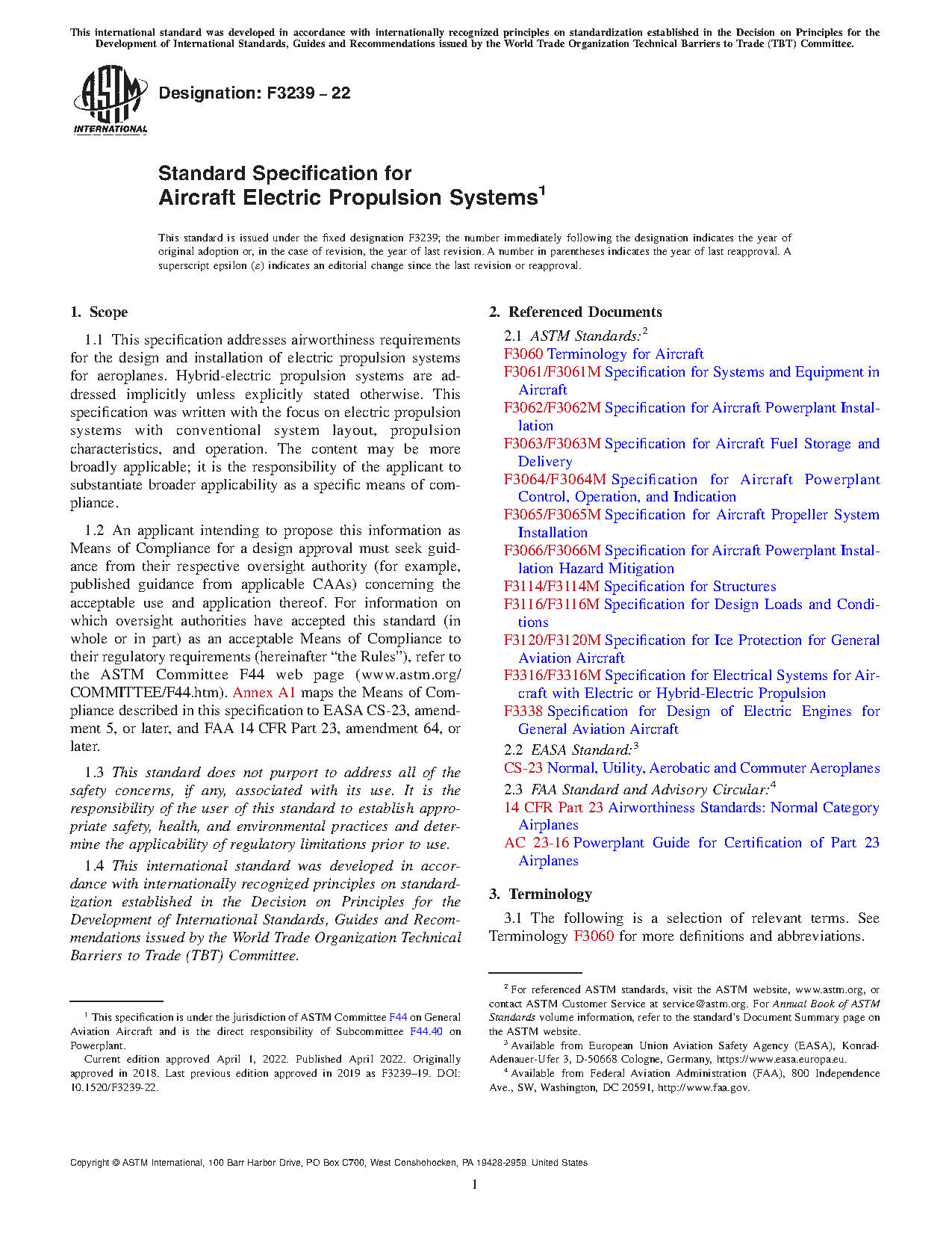 1.2 An applicant intending to propose this information as Means of Compliance for a design approval must seek guidance from their respective oversight authority (for example, published guidance from applicable CAAs) concerning the acceptable use and application thereof. For information on which oversight authorities have accepted this standard (in whole or in part) as an acceptable Means of Compliance to their regulatory requirements (hereinafter “the Rules”), refer to the ASTM Committee F44 web page (www.astm.org/COMMITTEE/F44.htm). Annex A1 maps the Means of Compliance described in this specification to EASA CS-23, amendment 5, or later, and FAA 14 CFR Part 23, amendment 64, or later.