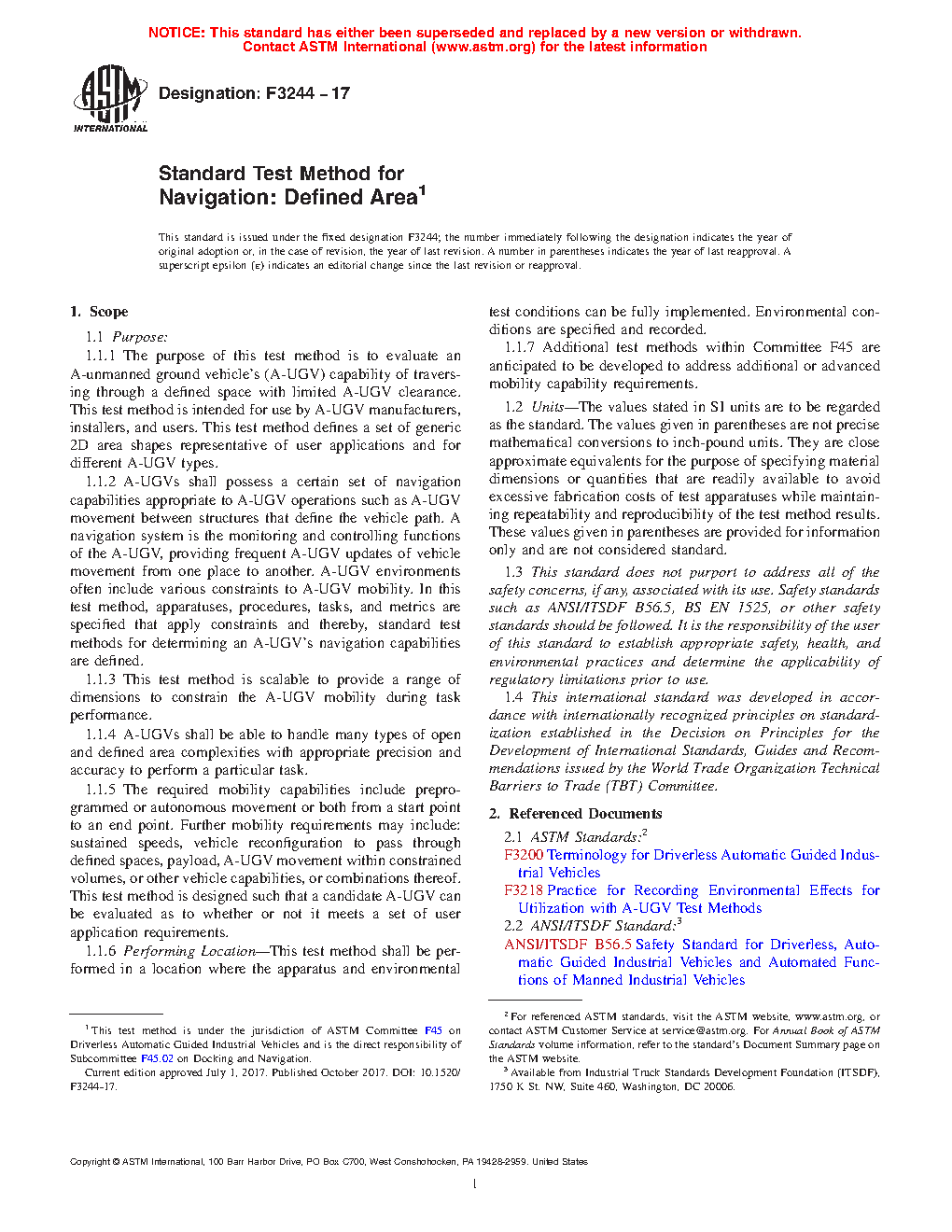 1.1.9 Additional test methods within Committee F45 are anticipated to be developed to address additional or advanced mobility capability requirements, such as a fleet of A-UGVs coordinating their movement through a facility.