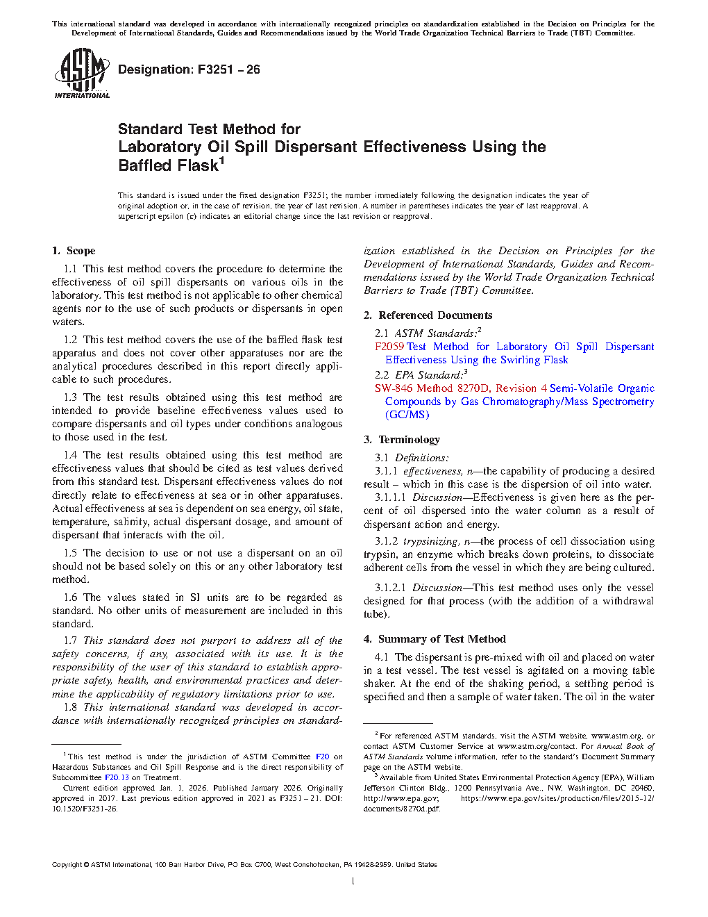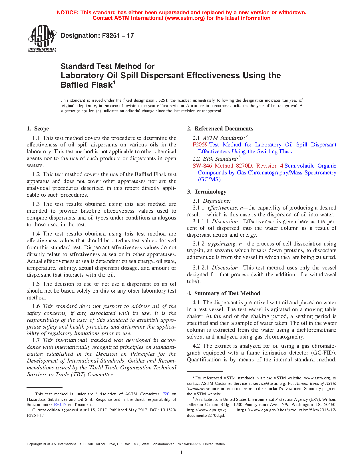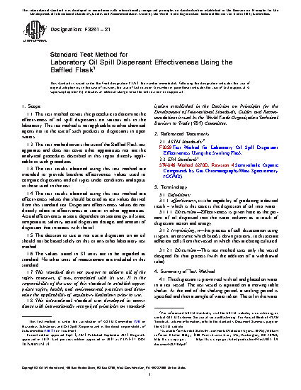 1.1 This test method covers the procedure to determine the effectiveness of oil spill dispersants on various oils in the laboratory. This test method is not applicable to other chemical agents nor to the use of such products or dispersants in open waters.