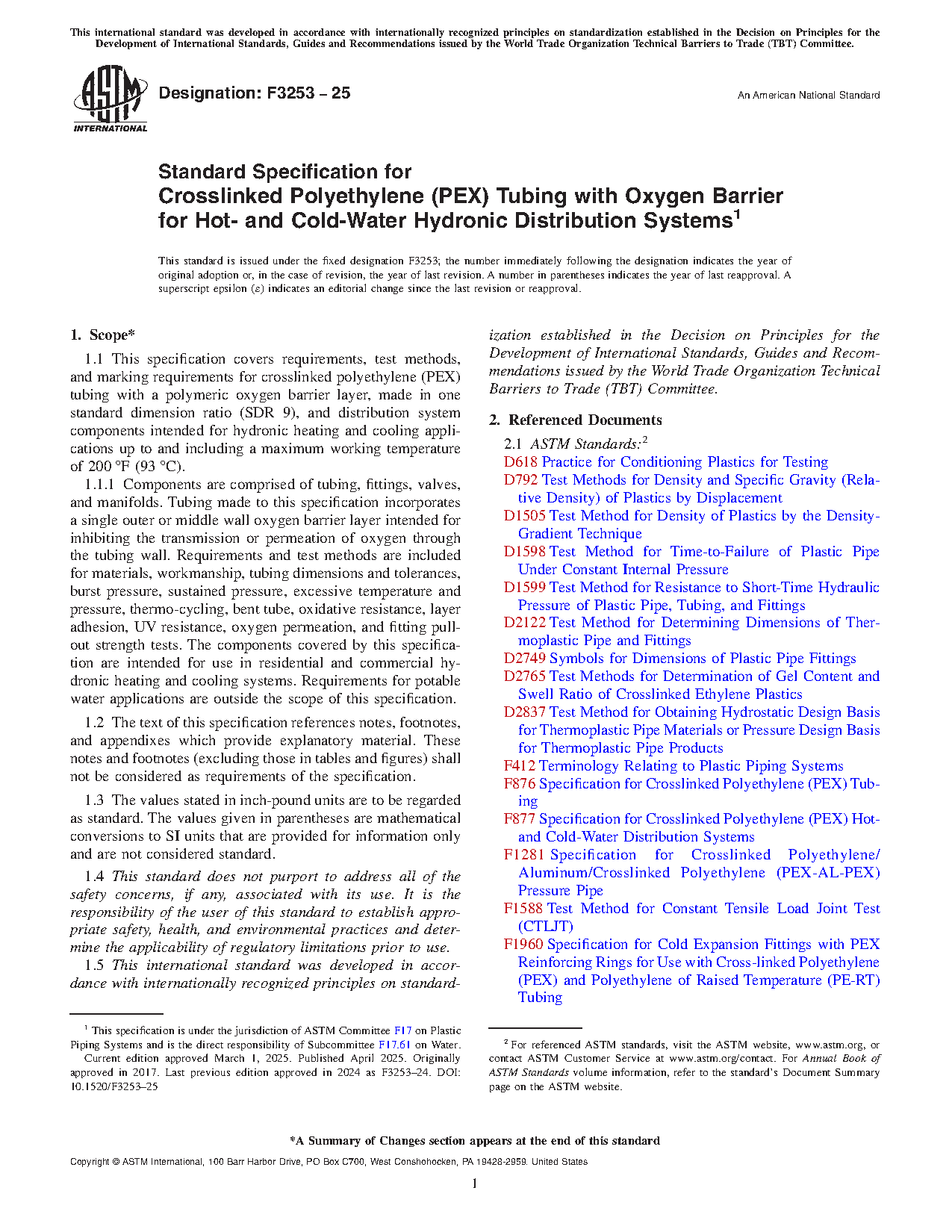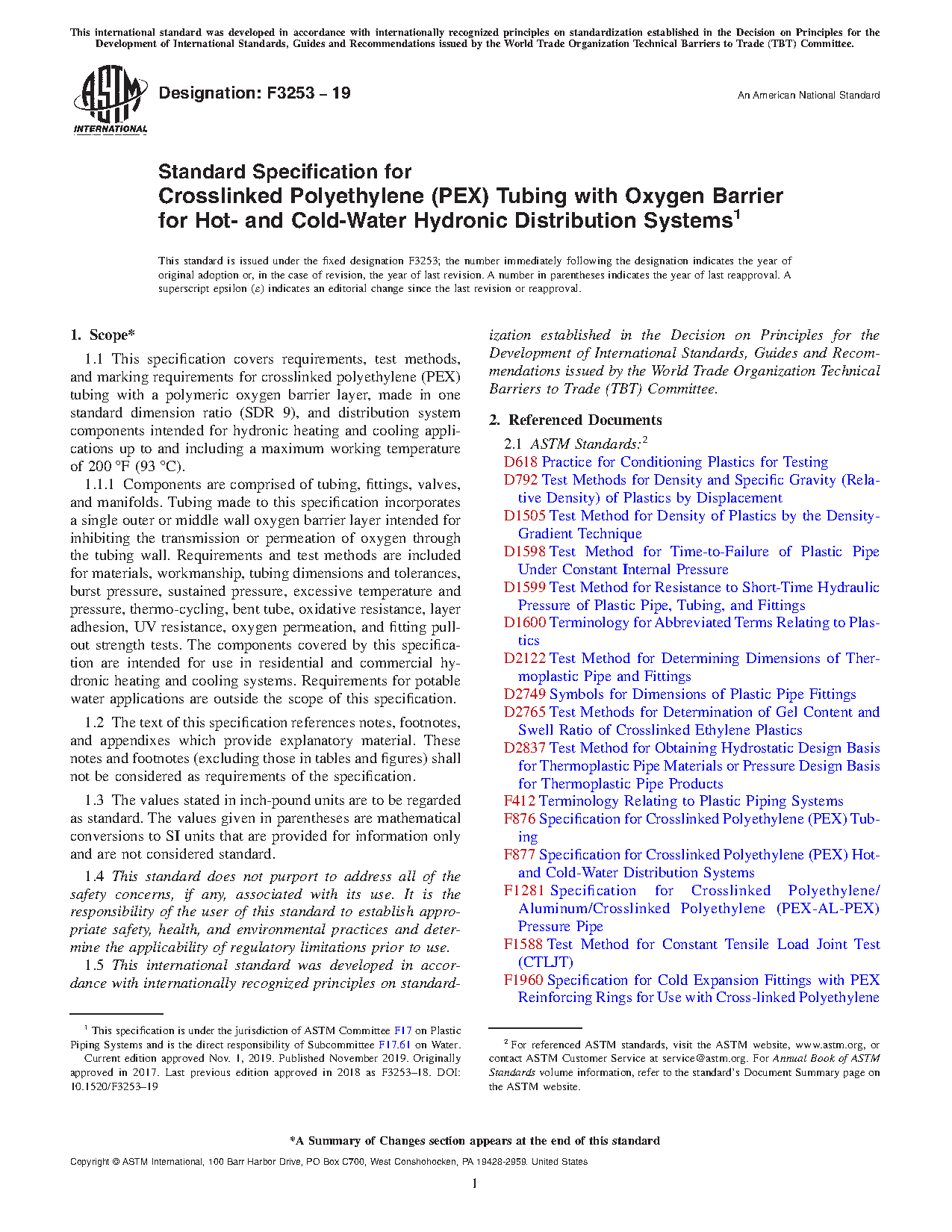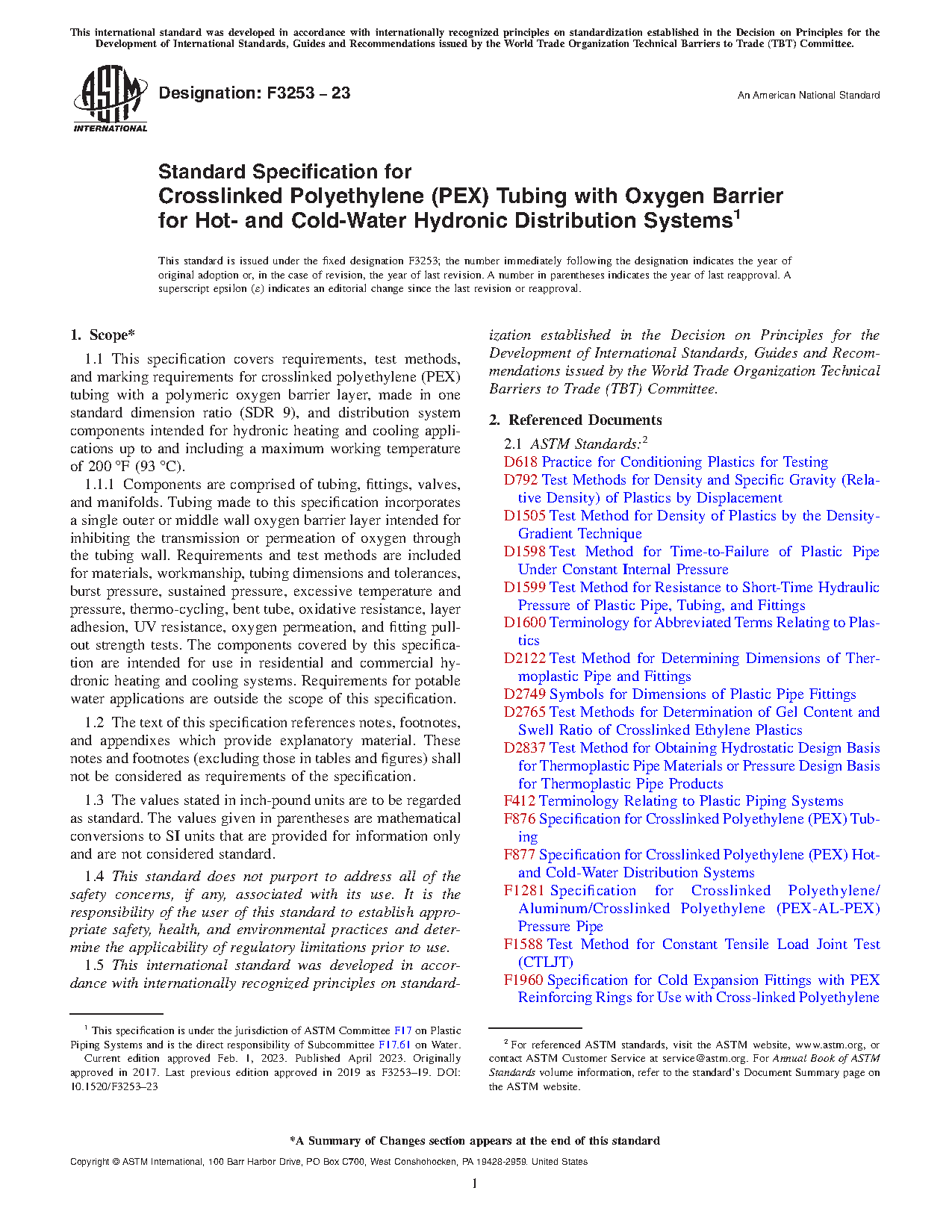 1.1 This specification covers requirements, test methods, and marking requirements for crosslinked polyethylene (PEX) tubing with a polymeric oxygen barrier layer, made in one standard dimension ratio (SDR 9), and distribution system components intended for hydronic heating and cooling applications up to and including a maximum working temperature of 200 °F (93 °C).