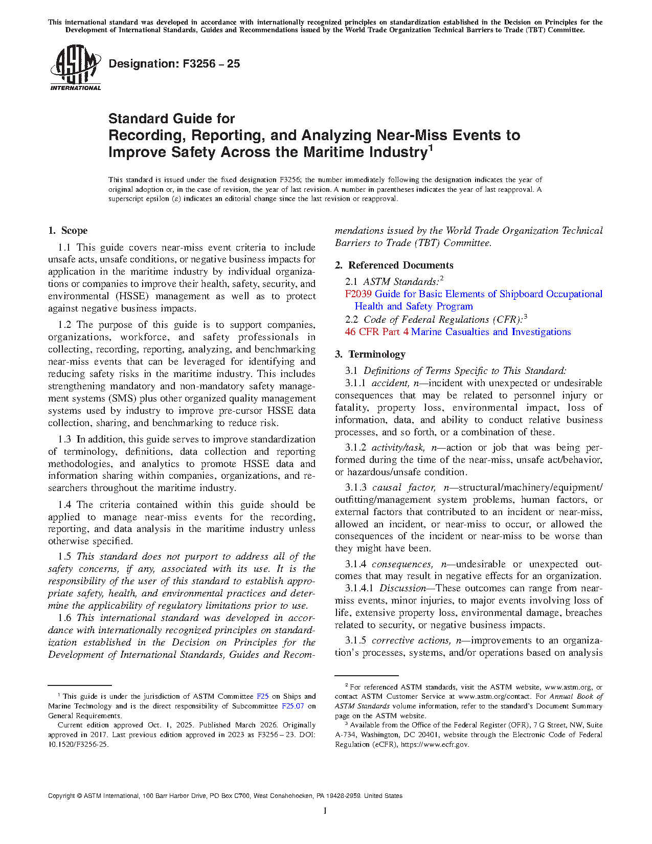 1.1 This guide provides near-miss reporting criteria and terminology for maritime vessels.