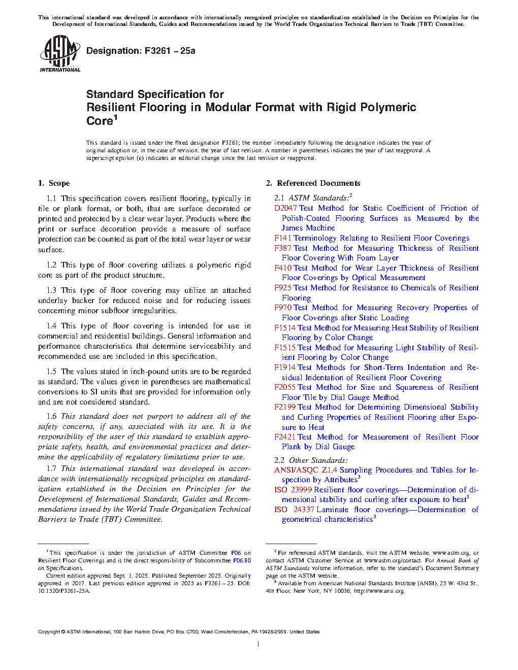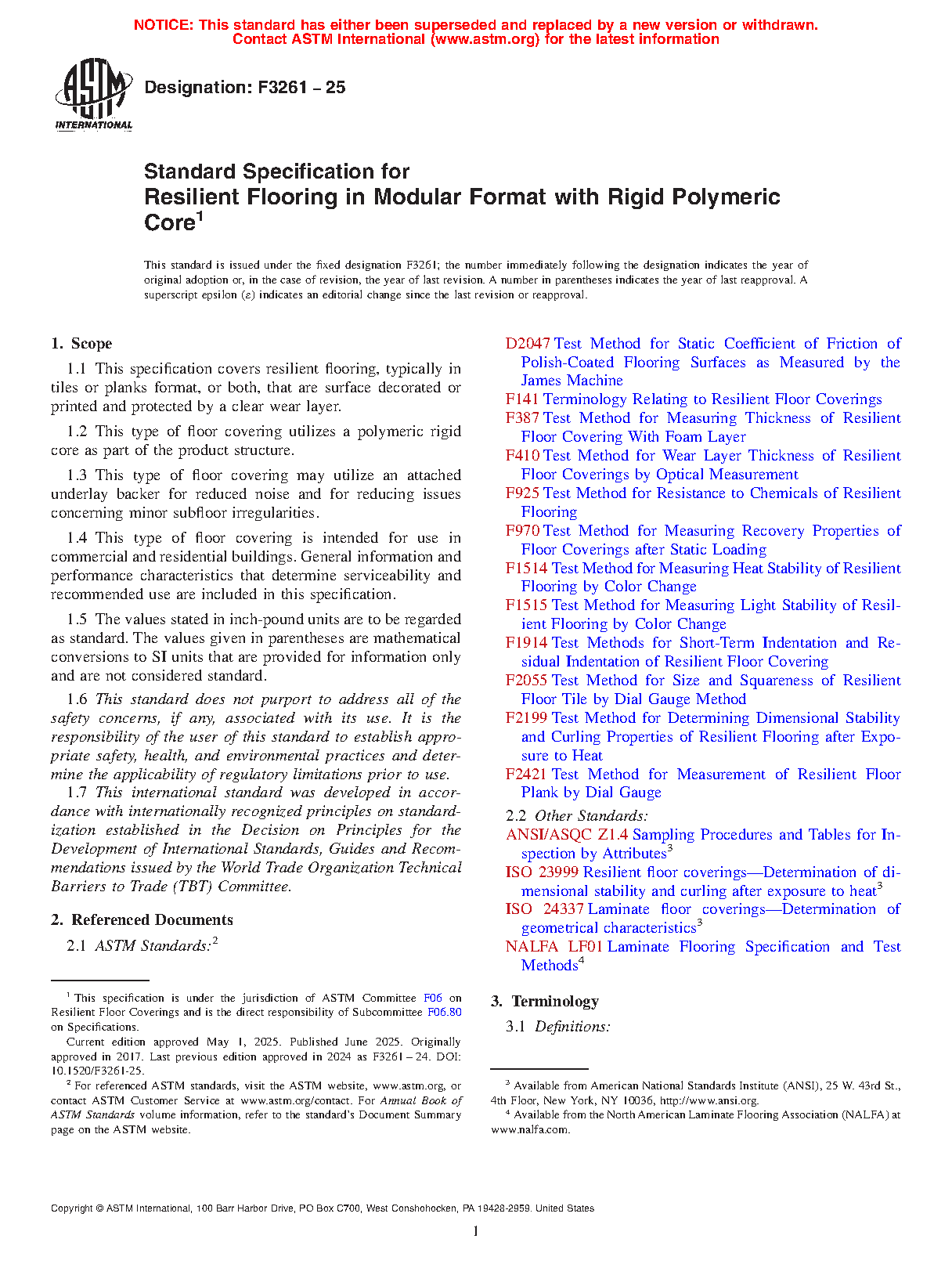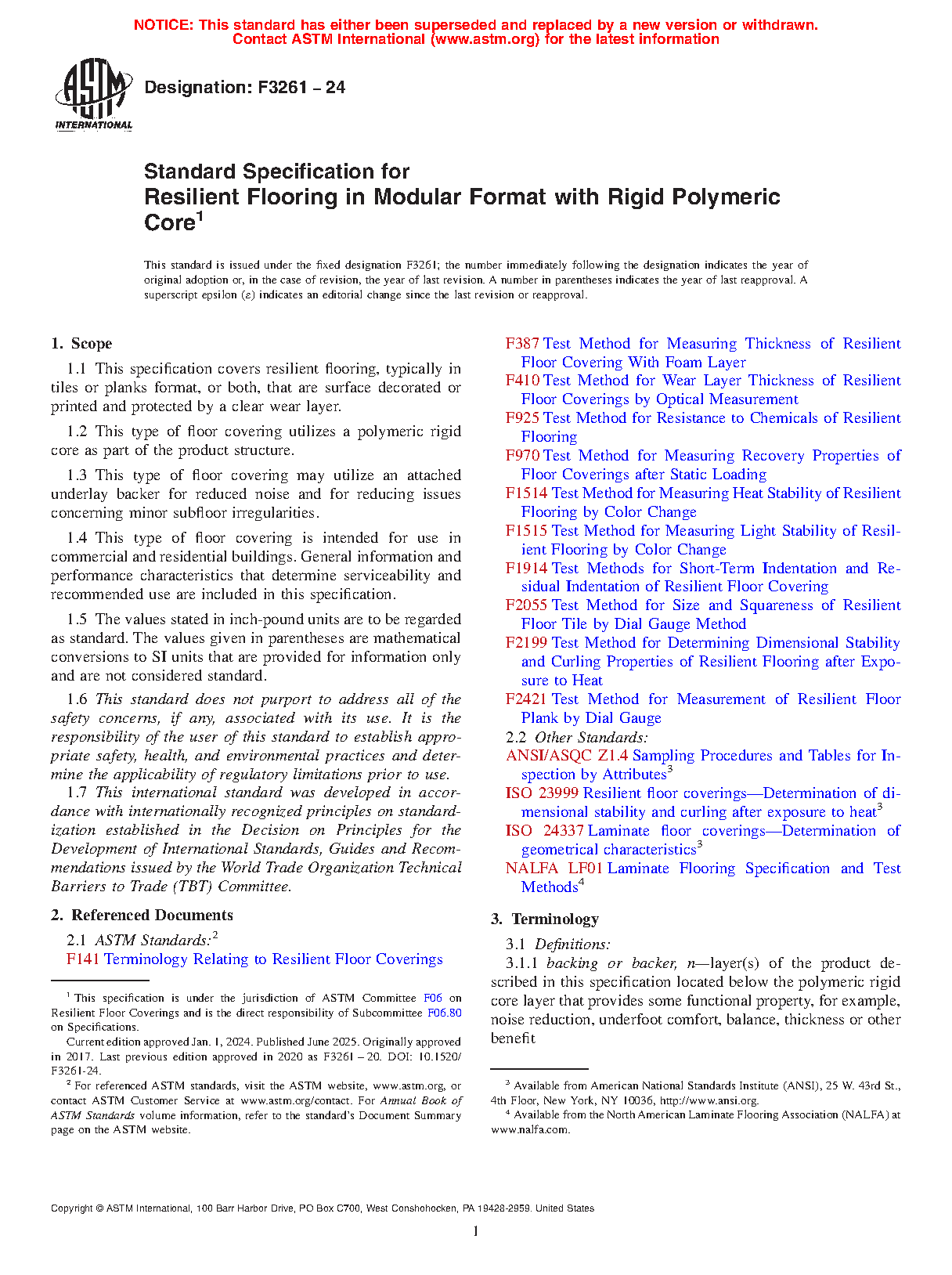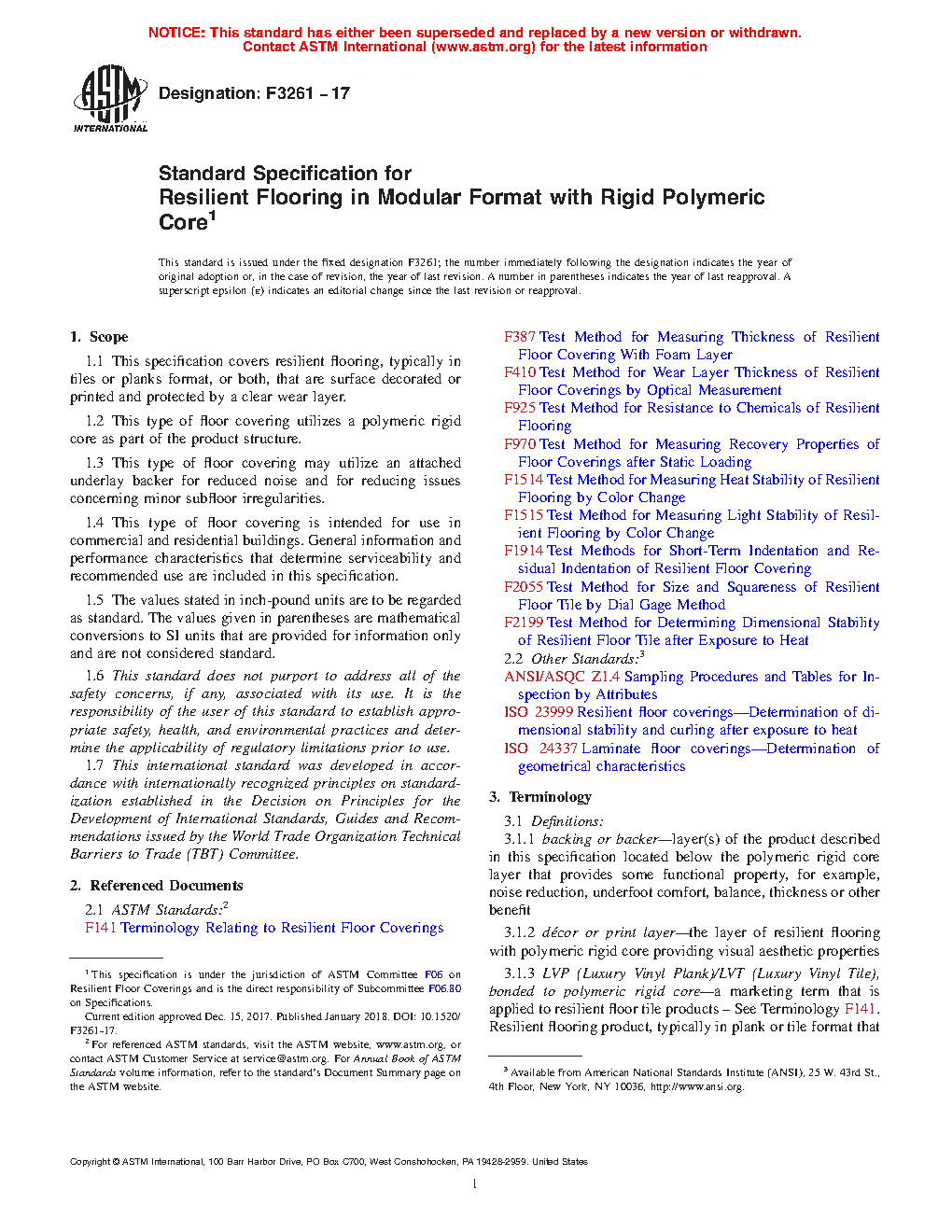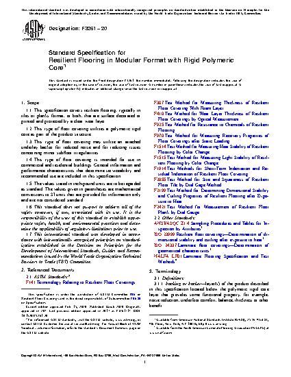 This specification establishes the material, manufacturing, physical, and performance requirements for resilient flooring, typically in tiles or planks format, or both, that are surface decorated or printed and protected by a clear wear layer. The product is a laminated resilient flooring structure that utilizes a polymeric rigid core as part of the product structure and is intended for use in commercial and residential buildings. This type of floor covering may also be manufactured with or without an attached underlay backer for better noise reduction and to help with accommodating minor subfloor irregularities. The wear surface of the resilient tile(s) or plank(s) shall be composed of binder, filler, and pigments compounded with suitable lubricants and processing aids. The binder consists of one or more polymers or copolymers of vinyl chloride, other modifying resins, plasticizers, and stabilizers. The polymers or copolymers of vinyl chloride comprise at least 60% of the weight of the binder. Any copolymer of vinyl chloride used shall contain at least 85% vinyl chloride.