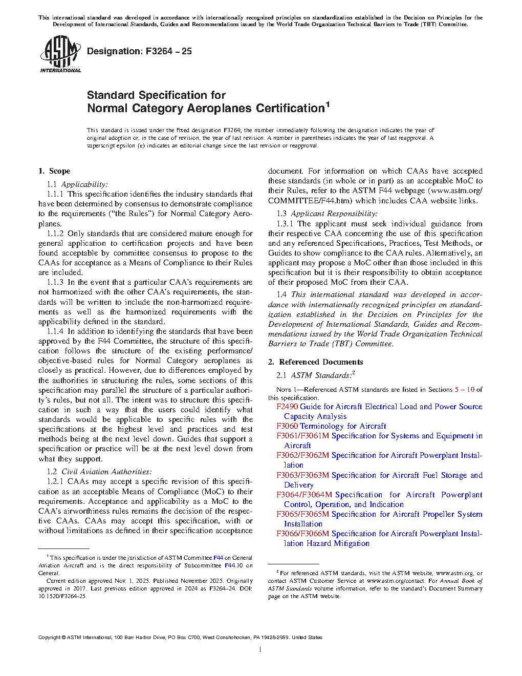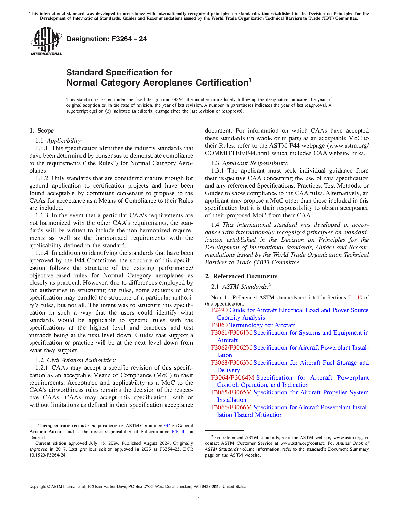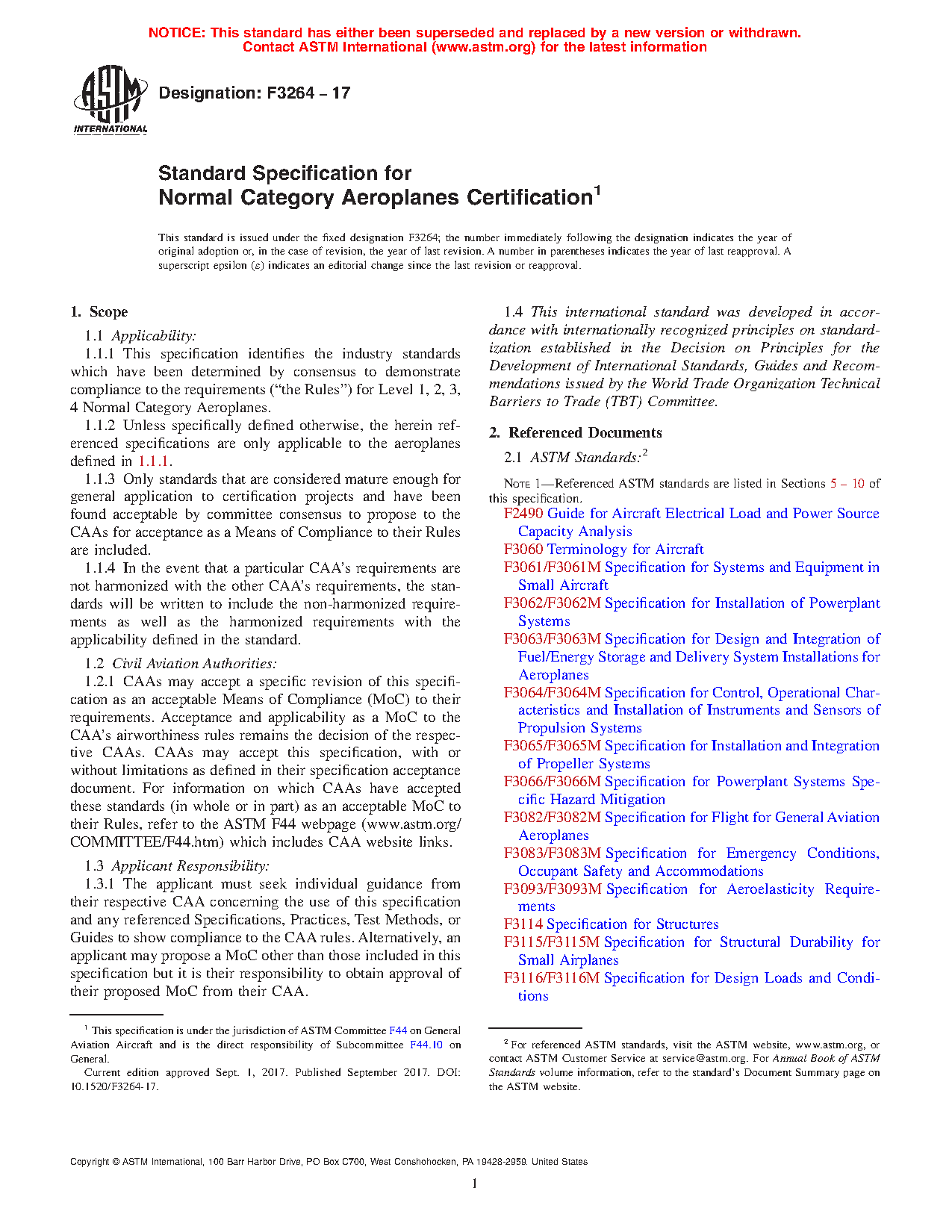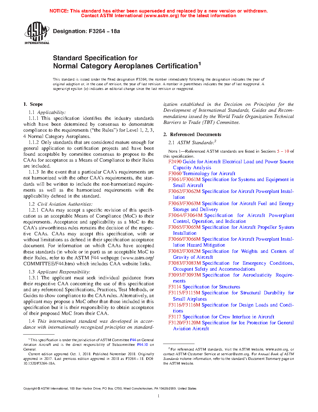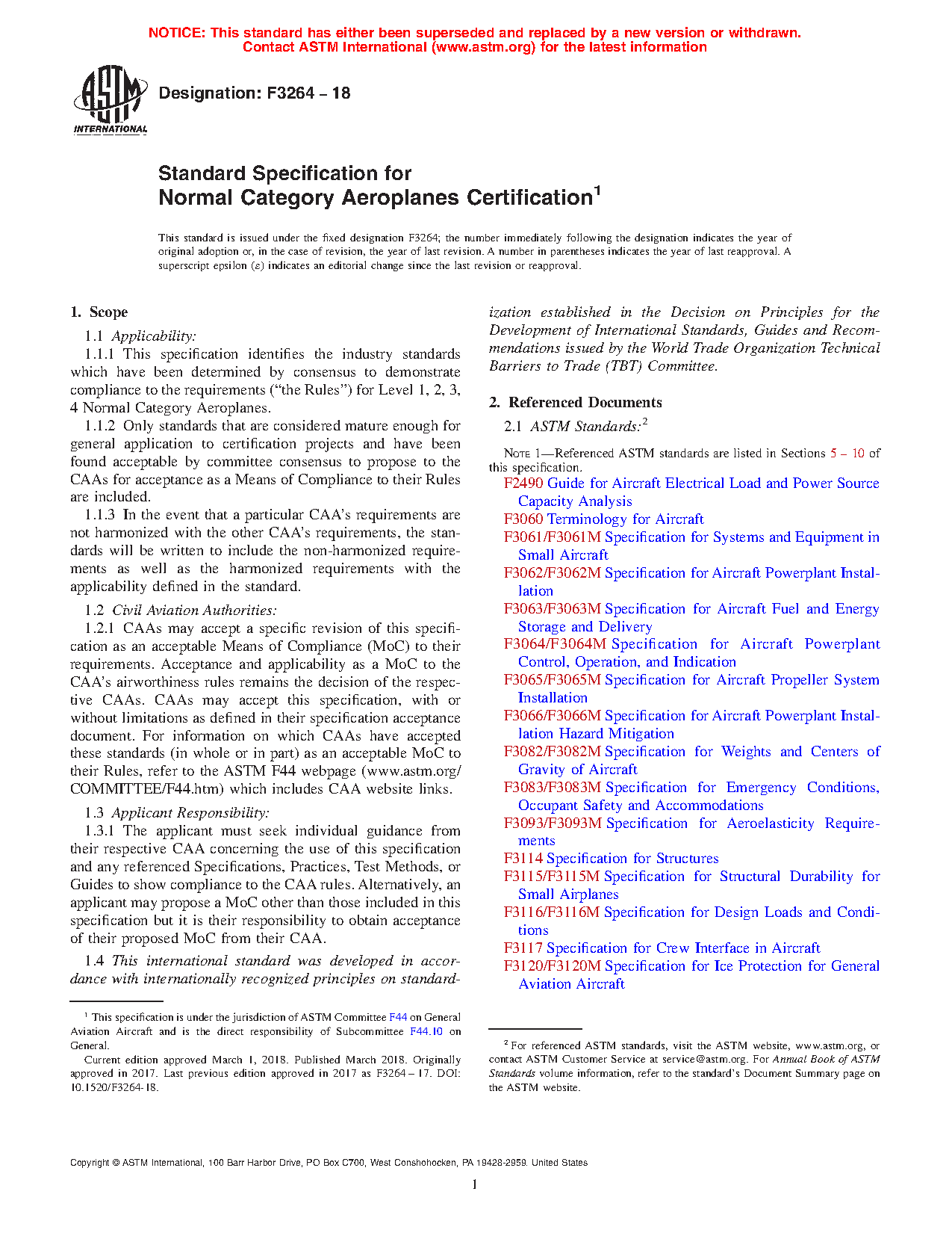 1.1.4 In addition to identifying the standards that have been approved by the F44 Committee, the structure of this specification follows the structure of the existing performance/objective-based rules for Normal Category aeroplanes as closely as practical. However, due to differences employed by the authorities in structuring the rules, some sections of this specification may parallel the structure of a particular authority’s rules, but not all. The intent was to structure this specification in such a way that the users could identify what standards would be applicable to specific rules with the specifications at the highest level and practices and test methods being at the next level down. Guides that support a specification or practice will be at the next level down from what they support.