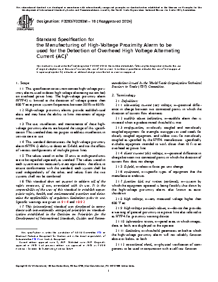 1.1 This specification covers non-contact high-voltage proximity alarms used to detect high voltage alternating current (ac) on overhead power lines. The high-voltage proximity alarm (HVPA) is limited to the detection of voltage greater than 600 V ac at power system frequencies between 50 Hz to 60 Hz.