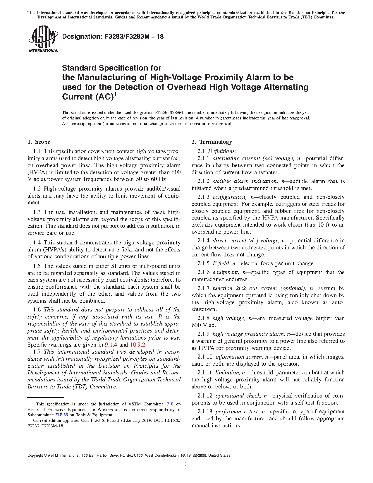1.1 This specification covers non-contact high-voltage proximity alarms used to detect high voltage alternating current (ac) on overhead power lines. The high-voltage proximity alarm (HVPA) is limited to the detection of voltage greater than 600 V ac at power system frequencies between 50 to 60 Hz.