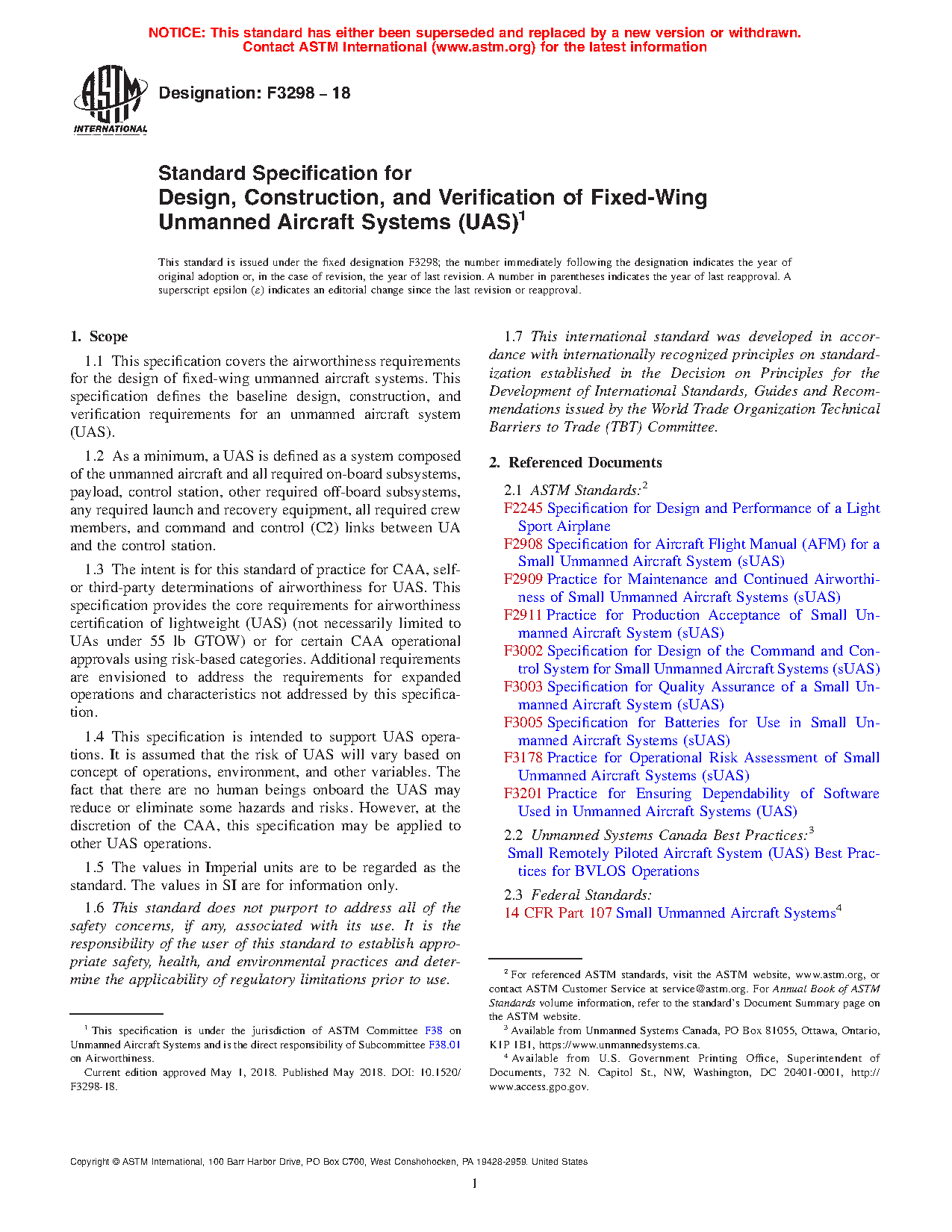 1.1 This specification covers the airworthiness requirements for the design of fixed-wing unmanned aircraft systems. This specification defines the baseline design, construction, and verification requirements for an unmanned aircraft system (UAS).