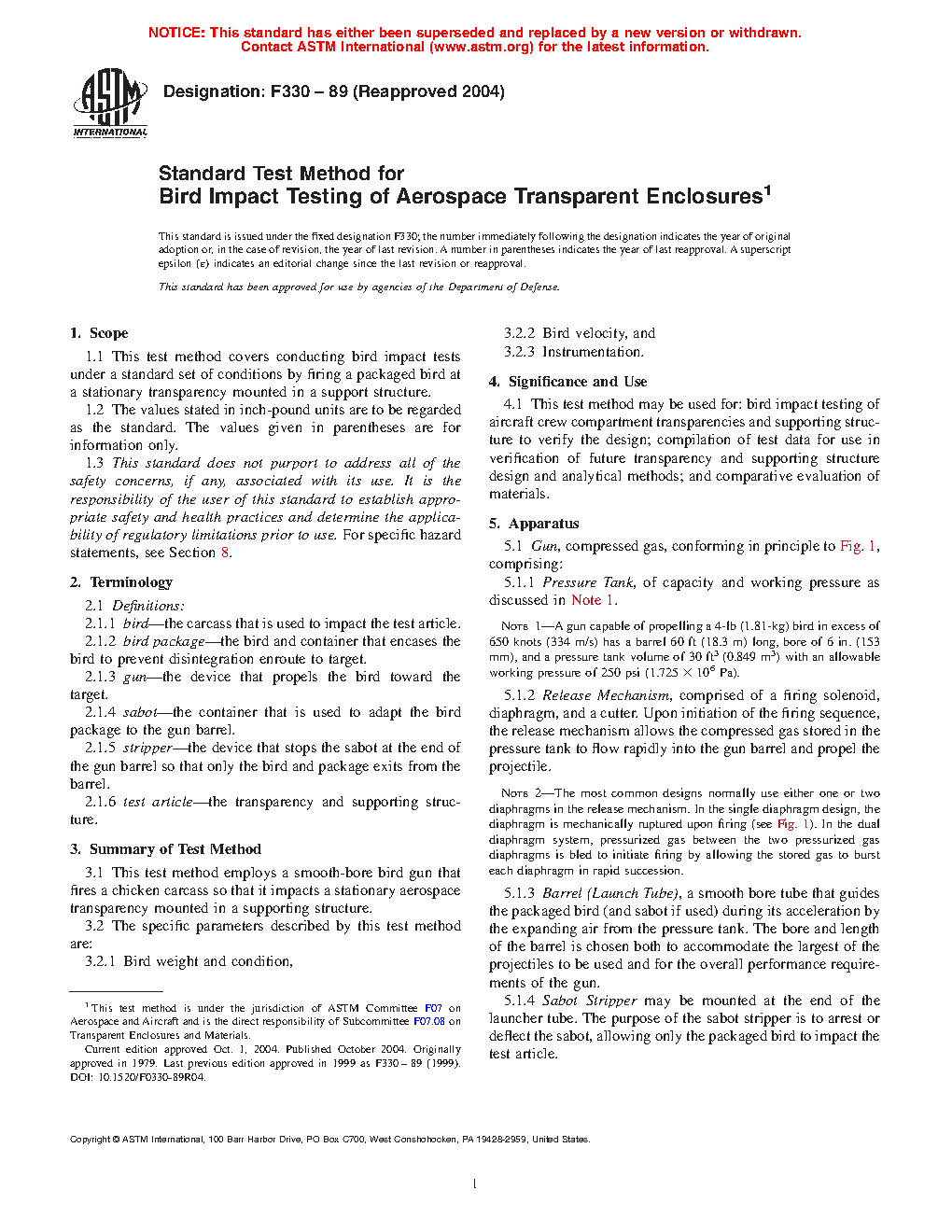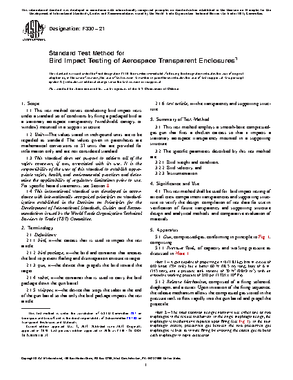 1.1 This test method covers conducting bird impact tests under a standard set of conditions by firing a packaged bird at a stationary transparency mounted in a support structure.