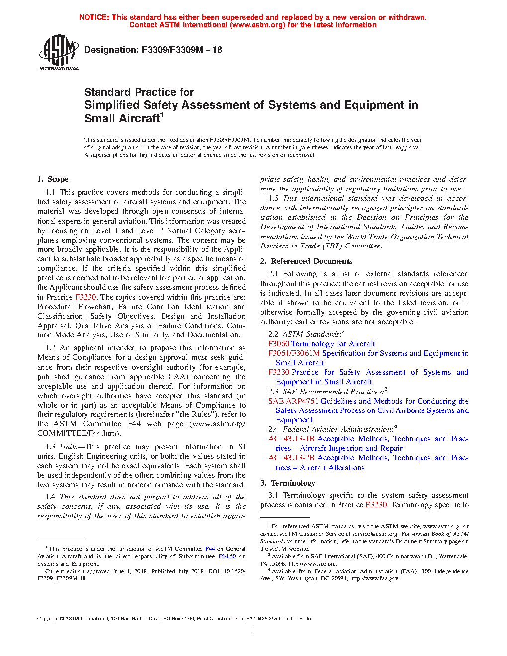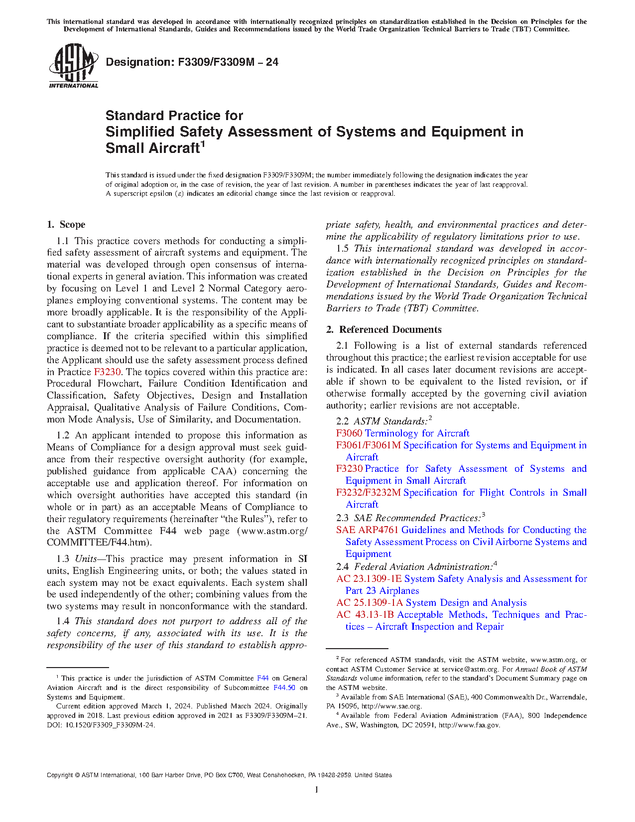 1.1 This practice covers methods for conducting a simplified safety assessment of aircraft systems and equipment. The material was developed through open consensus of international experts in general aviation. This information was created by focusing on Level 1 and Level 2 Normal Category aeroplanes employing conventional systems. The content may be more broadly applicable. It is the responsibility of the Applicant to substantiate broader applicability as a specific means of compliance. If the criteria specified within this simplified practice is deemed not to be relevant to a particular application, the Applicant should use the safety assessment process defined in Practice F3230. The topics covered within this practice are: Procedural Flowchart, Failure Condition Identification and Classification, Safety Objectives, Design and Installation Appraisal, Qualitative Analysis of Failure Conditions, Common Mode Analysis, Use of Similarity, and Documentation.