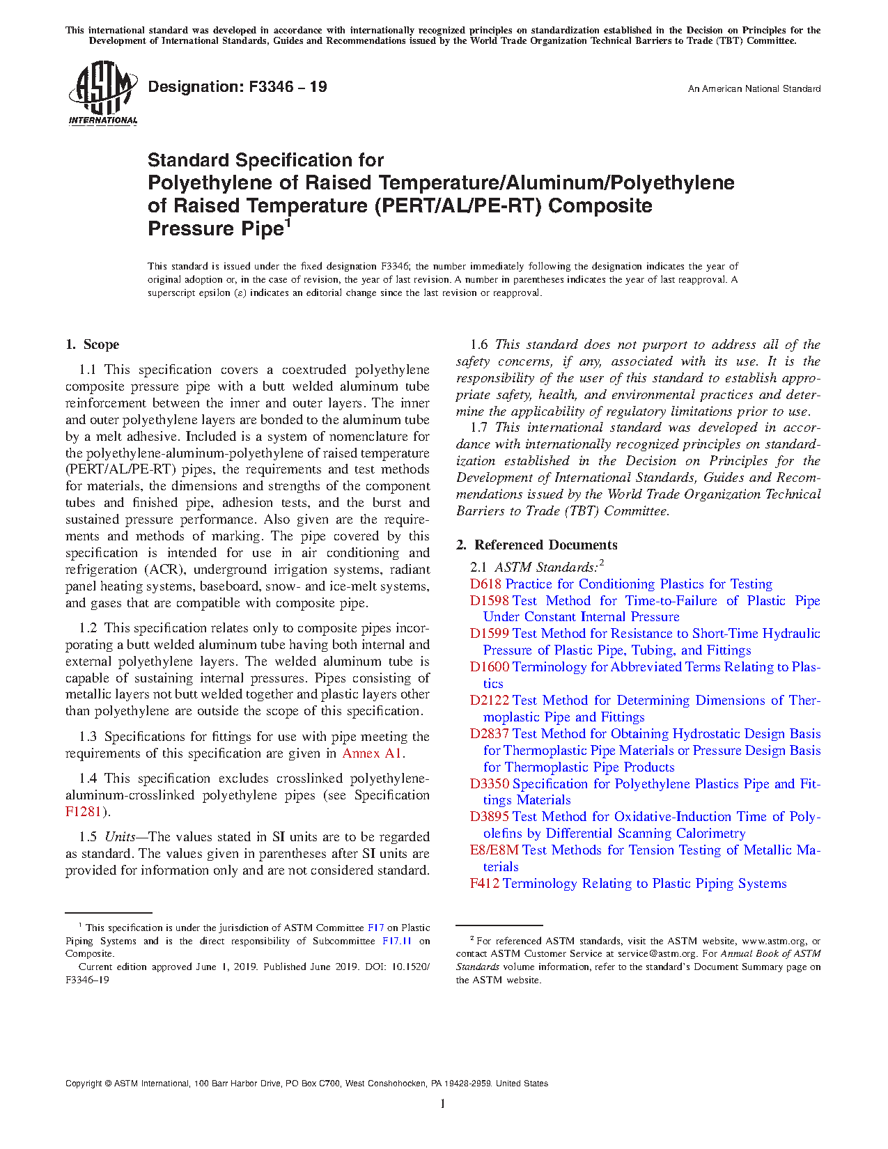 1.1 This specification covers a coextruded polyethylene composite pressure pipe with a butt welded aluminum tube reinforcement between the inner and outer layers. The inner and outer polyethylene layers are bonded to the aluminum tube by a melt adhesive. Included is a system of nomenclature for the polyethylene-aluminum-polyethylene of raised temperature (PE-RT/AL/PE-RT) pipes, the requirements and test methods for materials, the dimensions and strengths of the component tubes and finished pipe, adhesion tests, and the burst and sustained pressure performance. Also given are the requirements and methods of marking. The pipe covered by this specification is intended for use in air conditioning and refrigeration (ACR), underground irrigation systems, radiant panel heating systems, baseboard, snow- and ice-melt systems, and gases that are compatible with composite pipe.