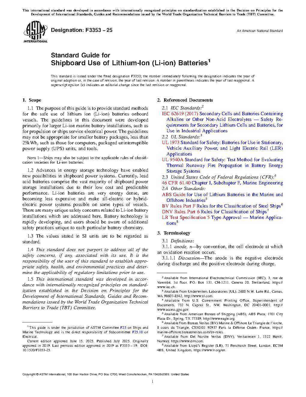 1.1 The purpose of this guide is to provide standard methods for the safe use of lithium ion (Li-ion) batteries onboard vessels. The guidelines in this document were developed primarily for larger Li-ion marine battery installations, such as for propulsion or ships service electrical power. The guidelines may not be appropriate for smaller battery packages, less than 25kWh, such as those for computers, packaged uninterruptible power supply (UPS) units, and tools.