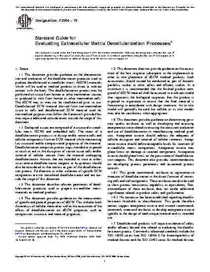 1.1 This document provides guidance on the characterization and evaluation of the decellularization processes used to produce decellularized extracellular matrix (dECM) materials which will be used as medical products in direct or indirect contact with the body. The decellularization process may be performed on tissue from human or other mammalian sources or produced in vitro from human or other mammalian cells. The dECM may or may not be recellularized prior to use. Decellularized ECM material derived from non-mammalian tissue or cells and decellularized ECM material used for non-medical purposes may follow the framework provided but may require additional considerations outside the scope of this document.