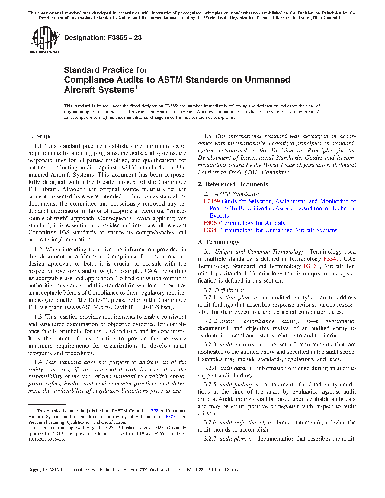 1.1 This standard practice establishes the minimum set of requirements for auditing programs, methods, and systems, the responsibilities for all parties involved, and qualifications for entities conducting audits against ASTM standards on Unmanned Aircraft Systems.