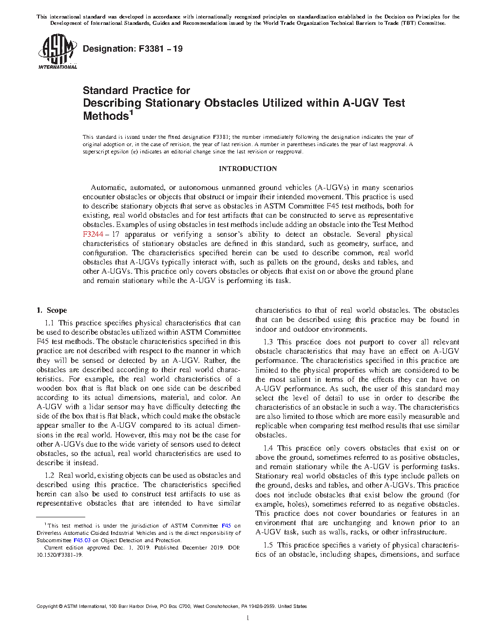 1.9 Obstacles described using this practice can be utilized in test methods specified by other ASTM Committee F45 standards, such as Test Method F3244 – 17. In the appendix, a baseline test is described that can be used to determine if an obstacle is able to be detected by an A-UGV’s sensors prior to utilizing the obstacle in another ASTM Committee F45 test method (see X1.2).