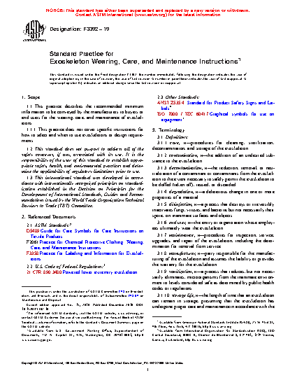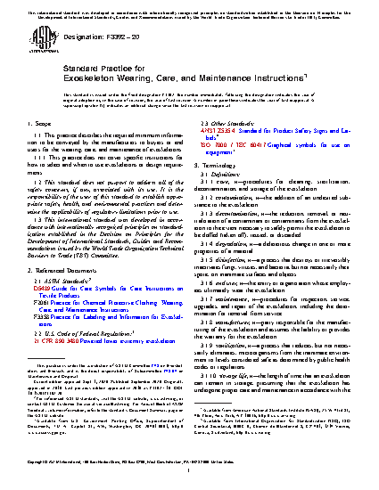 1.1 This practice describes the required minimum information to be conveyed by the manufacturers to buyers or end users for the wearing, care, and maintenance of exoskeletons.