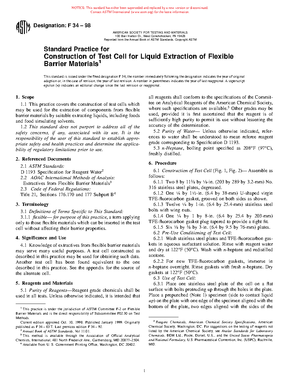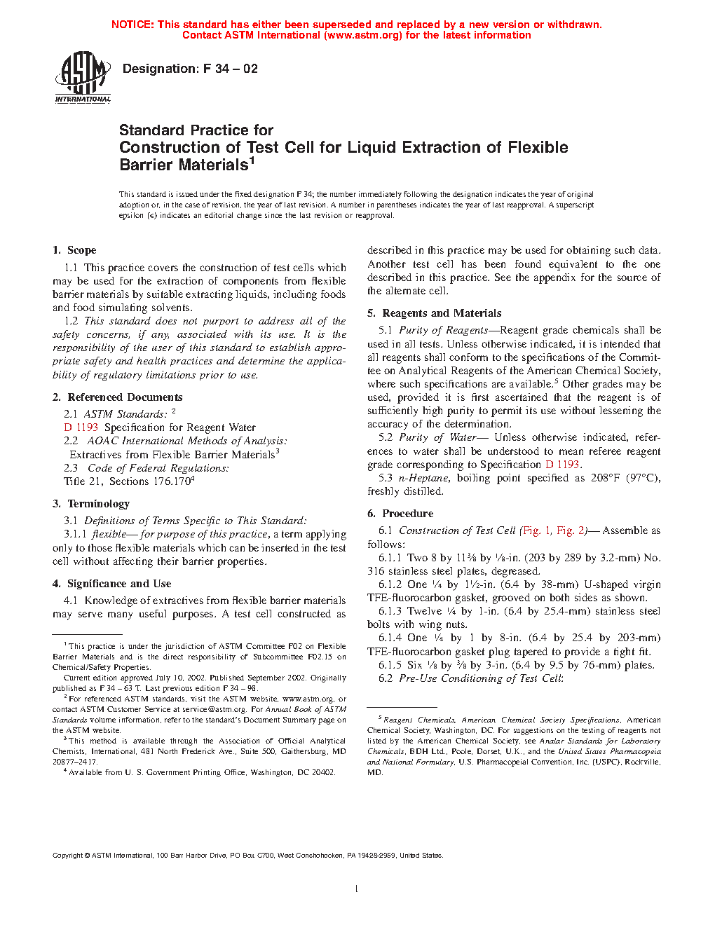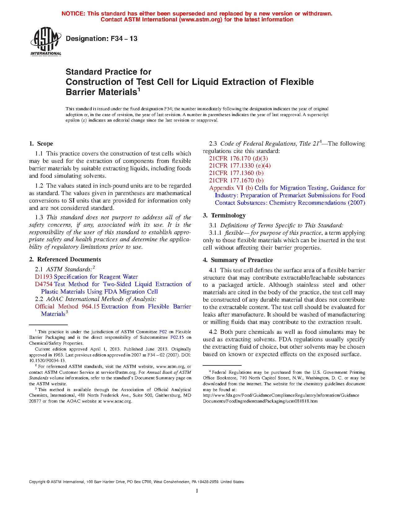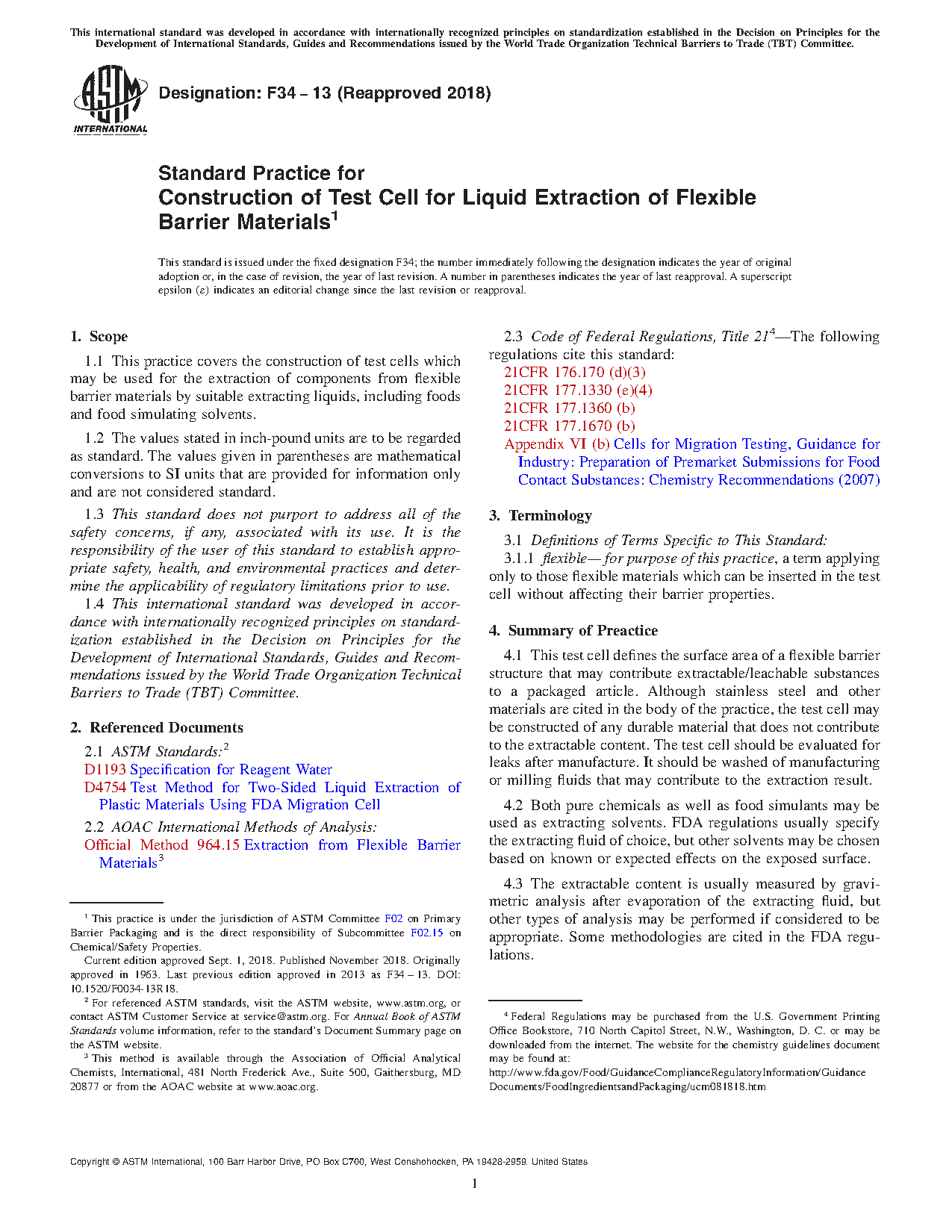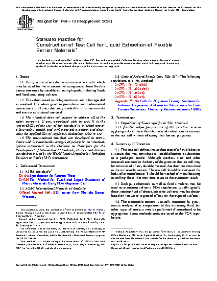 1.1 This practice covers the construction of test cells which may be used for the extraction of components from flexible barrier materials by suitable extracting liquids, including foods and food simulating solvents.