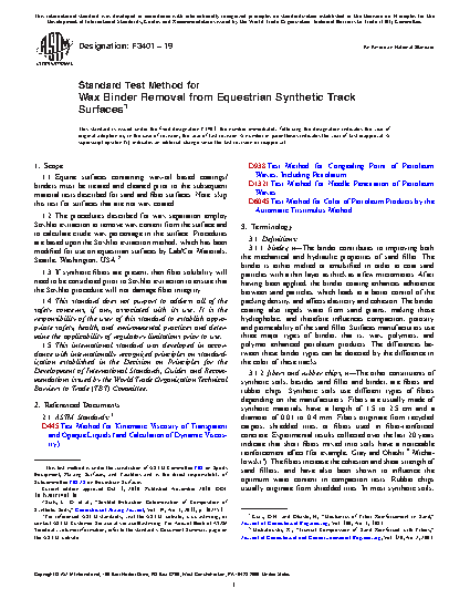 1.1 Equine surfaces containing wax-oil based coatings/binders must be treated and cleaned prior to the subsequent material tests described for sand and fiber surfaces. Note: skip this test for surfaces that are not wax coated.