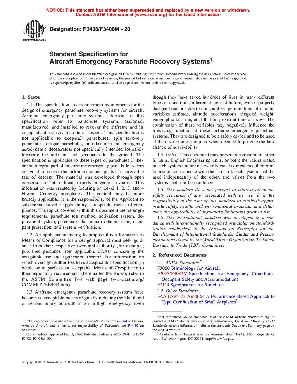 1.1 This specification covers minimum requirements for the design of emergency parachute recovery systems for aircraft. Airframe emergency parachute systems addressed in this specification refer to parachute systems designed, manufactured, and installed to recover the airframe and its occupants at a survivable rate of descent. This specification is not applicable to deepstall parachutes, spin recovery parachutes, drogue parachutes, or other airframe emergency aerodynamic decelerators not specifically intended for safely lowering the airframe and occupants to the ground. The specification is applicable to these types of parachutes if they are an integral part of an airframe emergency parachute system designed to recover the airframe and occupants at a survivable rate of descent. The material was developed through open consensus of international experts in general aviation. This information was created by focusing on Level 1, 2, 3, and 4 Normal Category aeroplanes. The content may be more broadly applicable; it is the responsibility of the Applicant to substantiate broader applicability as a specific means of compliance. The topics covered within this document are: strength requirements, parachute test method, activation system, deployment system, parachute attachment to the airframe, occupant protection, and system verification.