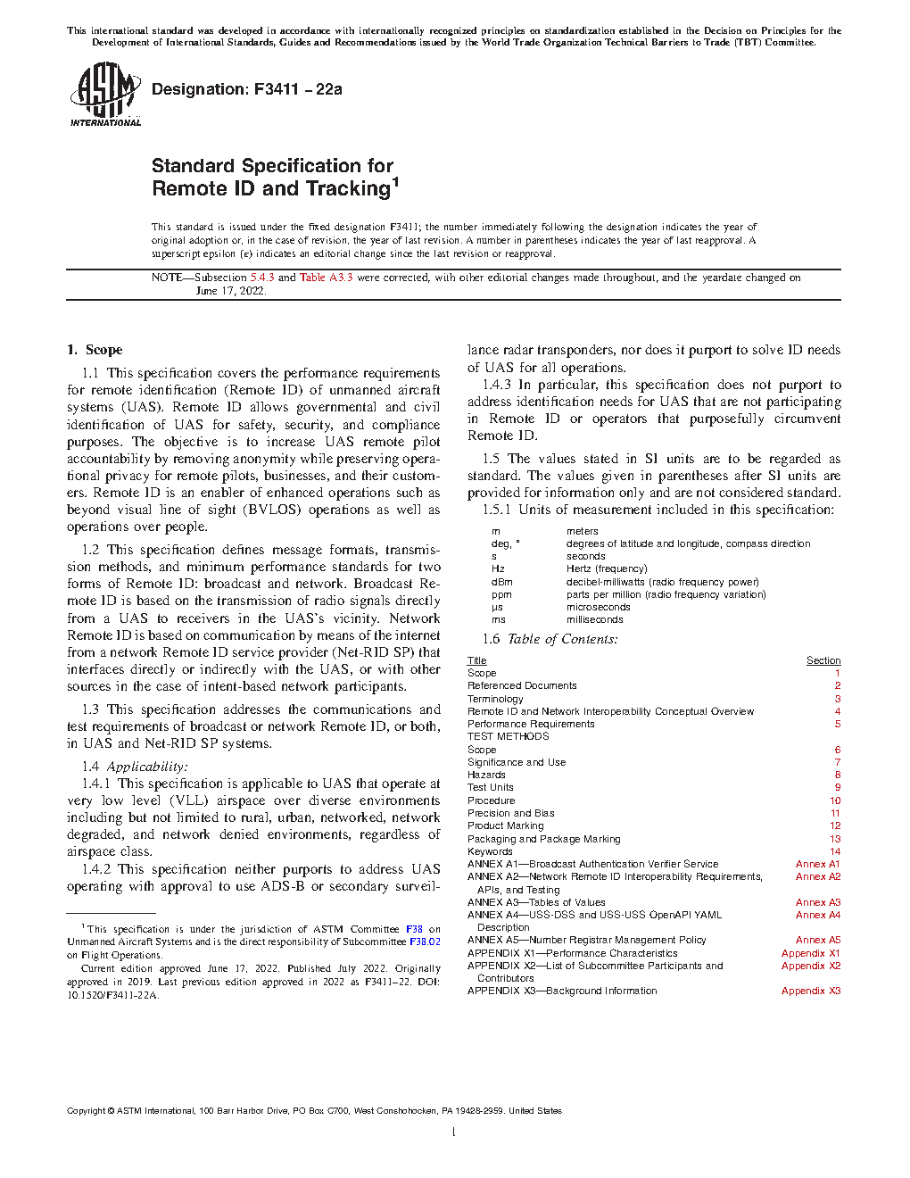 1.3 This specification addresses the communications and test requirements of broadcast or network Remote ID, or both, in UAS and Net-RID SP systems.