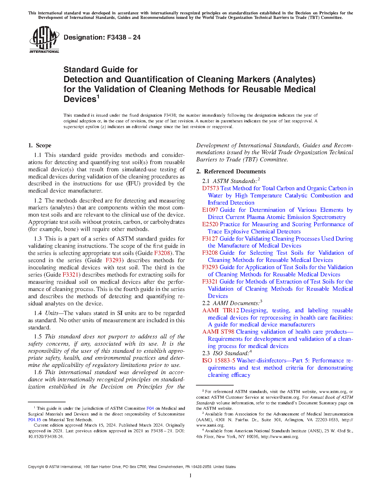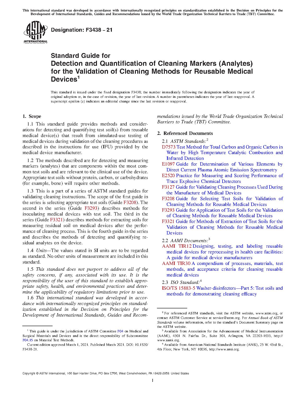 1.3 This is a part of a series of ASTM standard guides for validating cleaning instructions. The scope of the first guide in the series is selecting appropriate test soils (Guide F3208). The second in the series (Guide F3293) describes methods for inoculating medical devices with test soil. The third in the series (Guide F3321) describes methods for extracting soils for measuring residual soil on medical devices after the performance of cleaning process. This is the fourth guide in the series and describes the methods of detecting and quantifying residual analytes on the device.