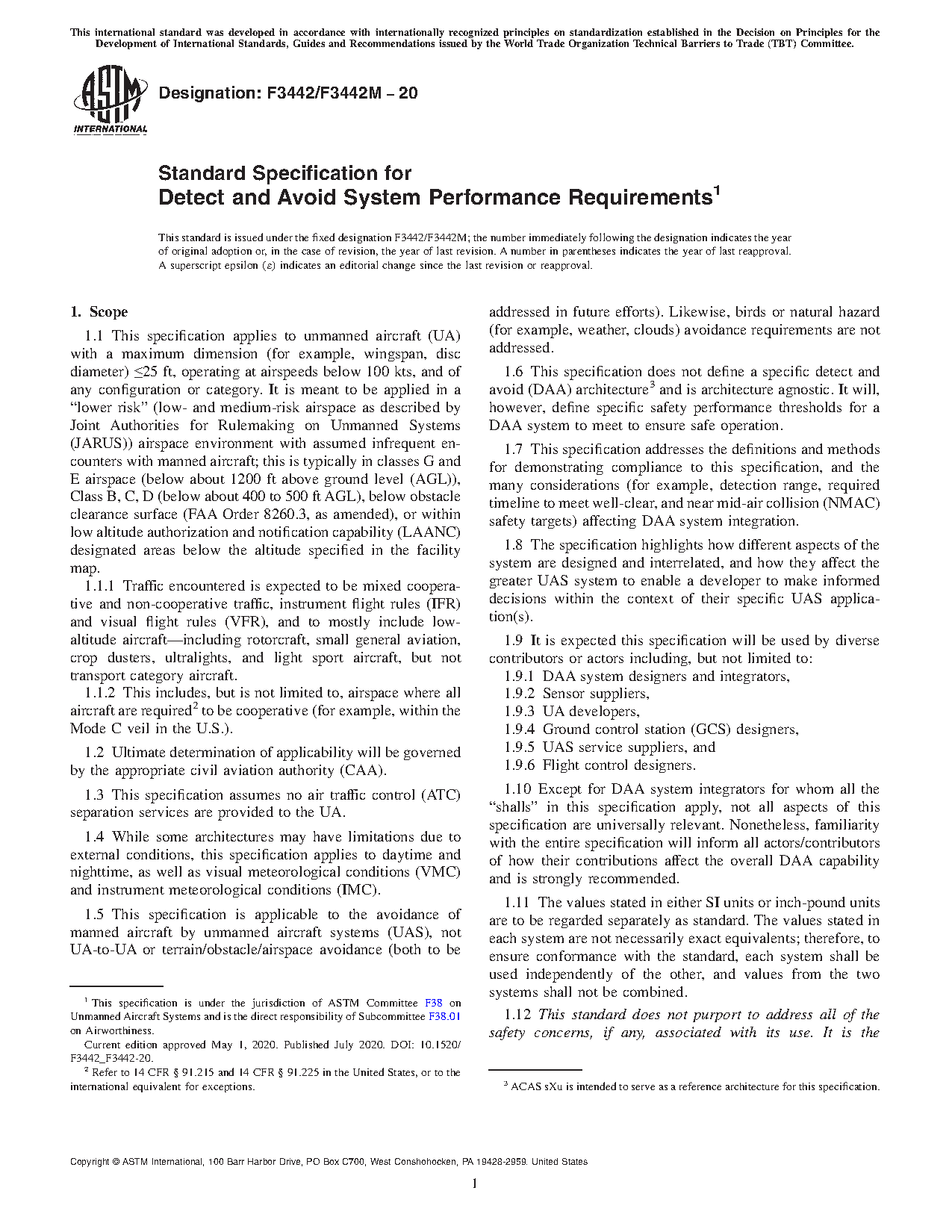 1.7 This specification addresses the definitions and methods for demonstrating compliance to this specification, and the many considerations (for example, detection range, required timeline to meet well clear, and near mid-air collision (NMAC) safety targets) affecting DAA system integration.
