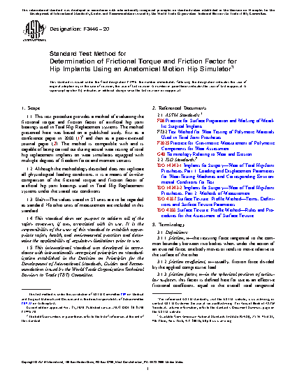 1.1 This test procedure provides a method of evaluating the frictional torque and friction factor of artificial hip joint bearings used in Total Hip Replacement systems. The method presented here was based on a published study, first as a conference paper in 2008 (1)2 and then as a peer-reviewed journal paper (2). The method is compatible with and is capable of being carried out during actual wear testing of total hip replacement implants on wear simulators equipped with multiple degrees of freedom force and moment sensors.
