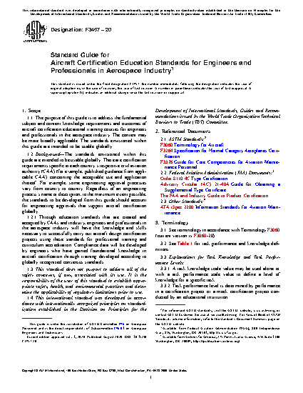 1.1 The purpose of this guide is to address the fundamental subject and content knowledge requirements and outcomes of aircraft certification educational training courses for engineers and professionals in the aerospace industry. The content may be more broadly applicable. The standards envisioned within this guide are intended to be usable globally.
