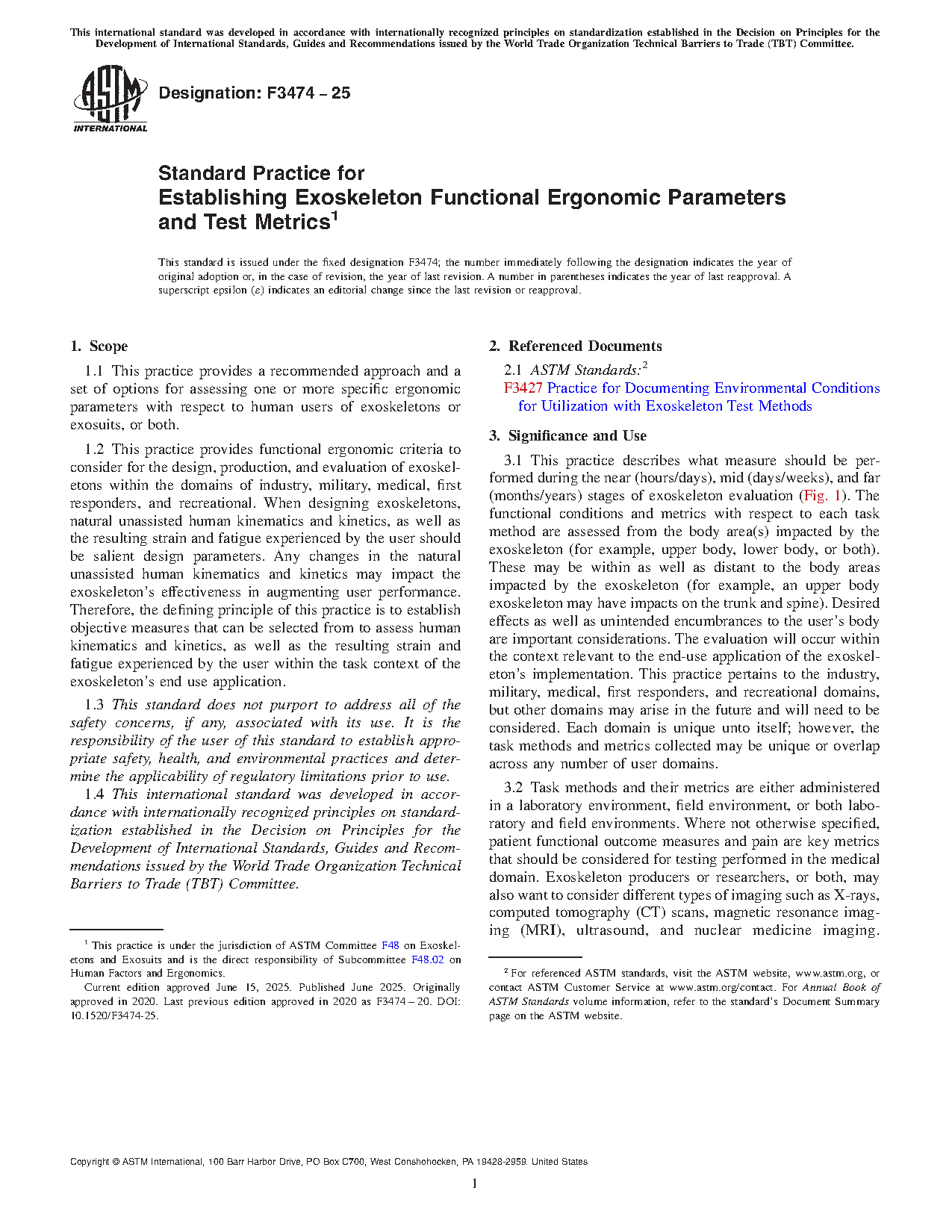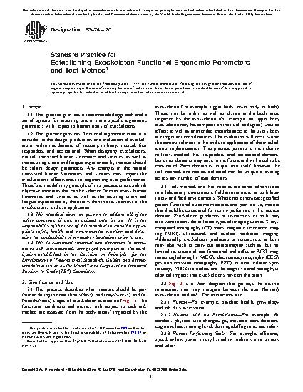 1.1 This practice provides a recommended approach and a set of options for assessing one or more specific ergonomic parameters with respect to human users of exoskeletons.