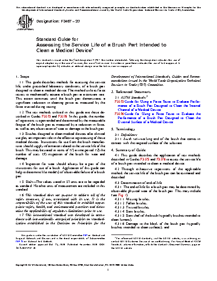 1.1 This guide describes methods for assessing the service life, under prescribed laboratory conditions, of a brush part designed to clean a medical device. The method utilizes force testers to mechanically actuate a brush part at a constant rate. This action continues until the brush part demonstrates a significant reduction in cleaning power as measured by the force exerted during testing.