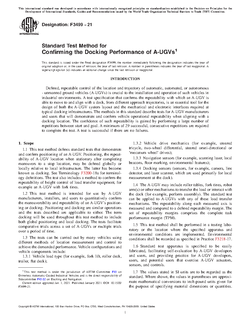 1.2 This test method is intended for use by A-UGV manufacturers, installers, and users to quantitatively confirm the maneuverability and repeatability of an A-UGV’s positioning or docking. Positioning and docking are similar operations and the tests described are applicable to either. The term docking will be used throughout this test method to include both global positioning and local docking. The tests facilitate comparative trials across a set of A-UGVs or multiple trials over a period of time.
