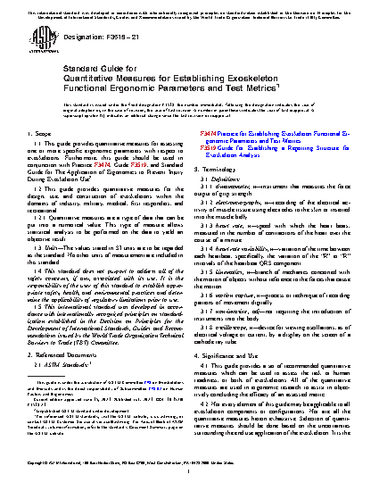1.1 This guide provides quantitative measures for assessing one or more specific ergonomic parameters with respect to exoskeletons. Furthermore, this guide should be used in conjunction with Practice F3474, Guide F3519, and Standard Guide for The Application of Ergonomics to Prevent Injury During Exoskeleton Use2.