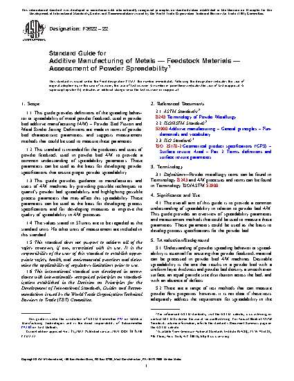 1.1 This guide provides definitions of the spreading behavior or spreadability of metal powder feedstock used in powder bed additive manufacturing (AM) – Powder Bed Fusion and Metal Binder Jetting. Definitions are made in terms of powder bed characteristic parameters, and suggests measurement methods that could be used to measure these parameters.